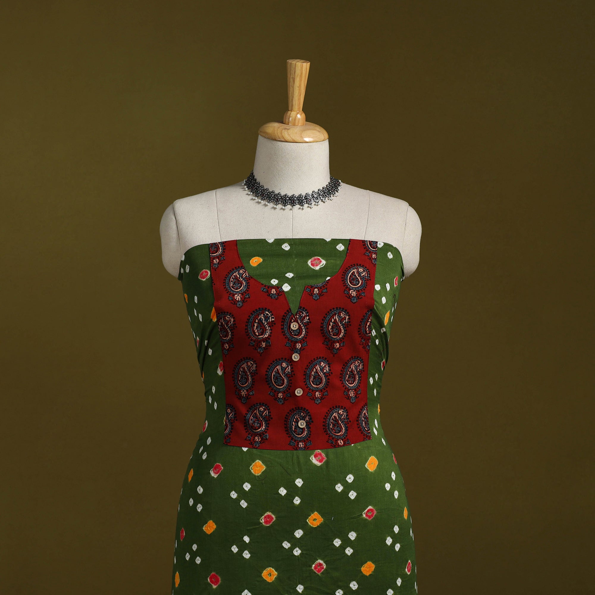 Green - Bandhani Patchwork Cotton Unstitched Kurta Material (3m) 33