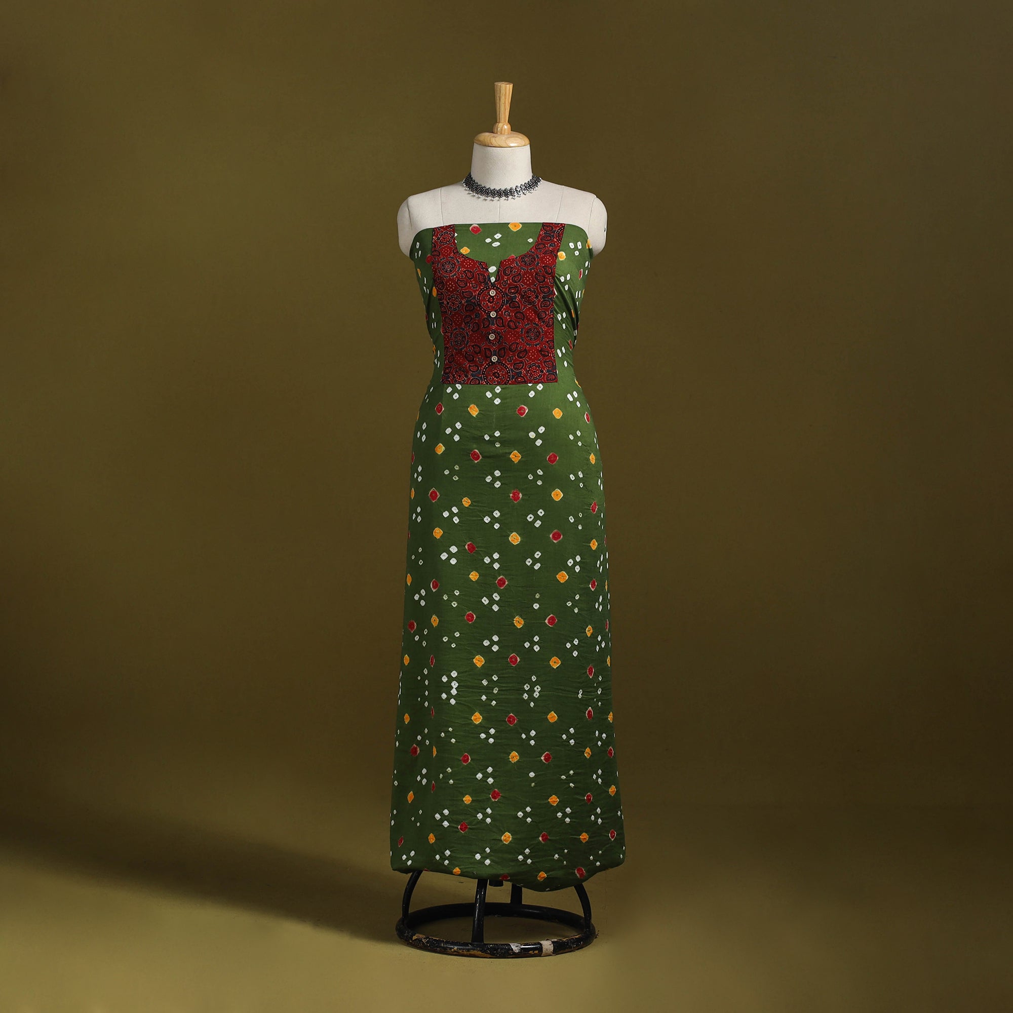 Green bandhani cotton unstitched kurta material from Kutch. Made using traditional tie-dye technique, to create bandhej patterns. It features patchwork detailing, which adds a handcrafted touch. Ideal for stitching kurtas, fusion tops or tunics.