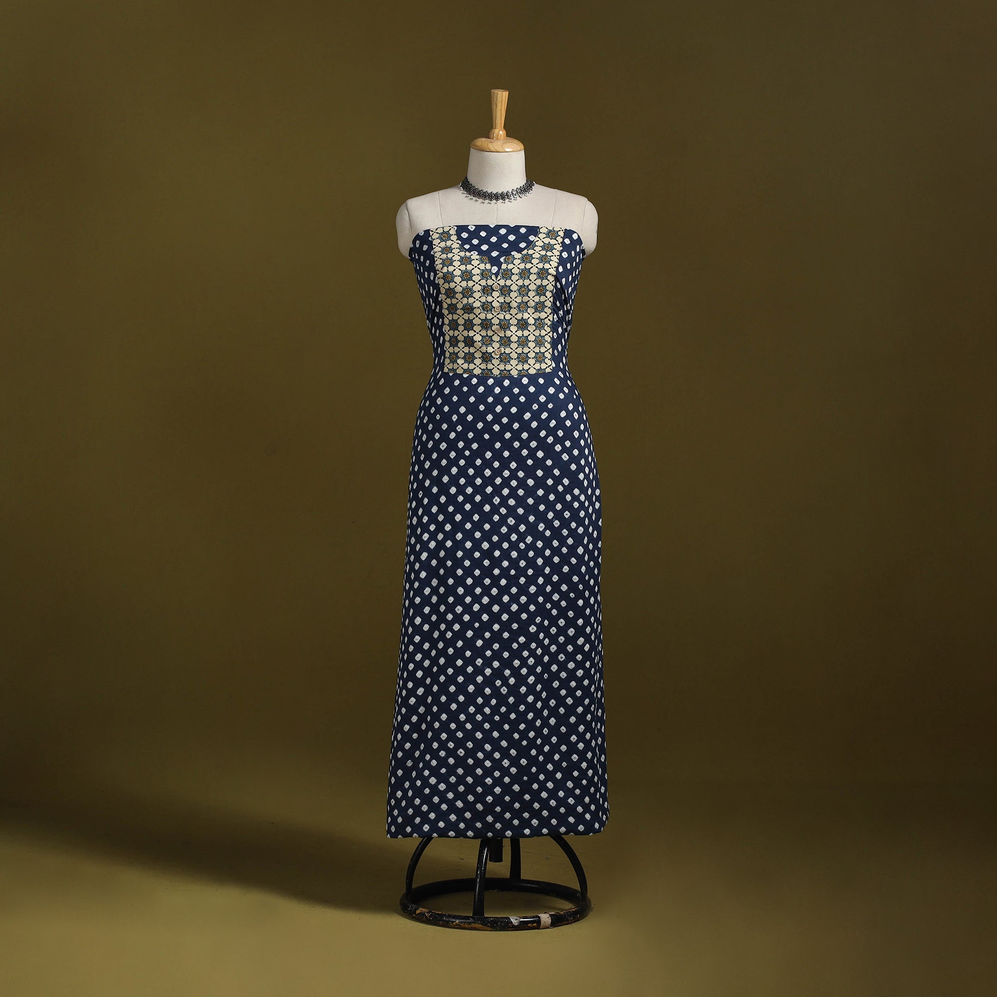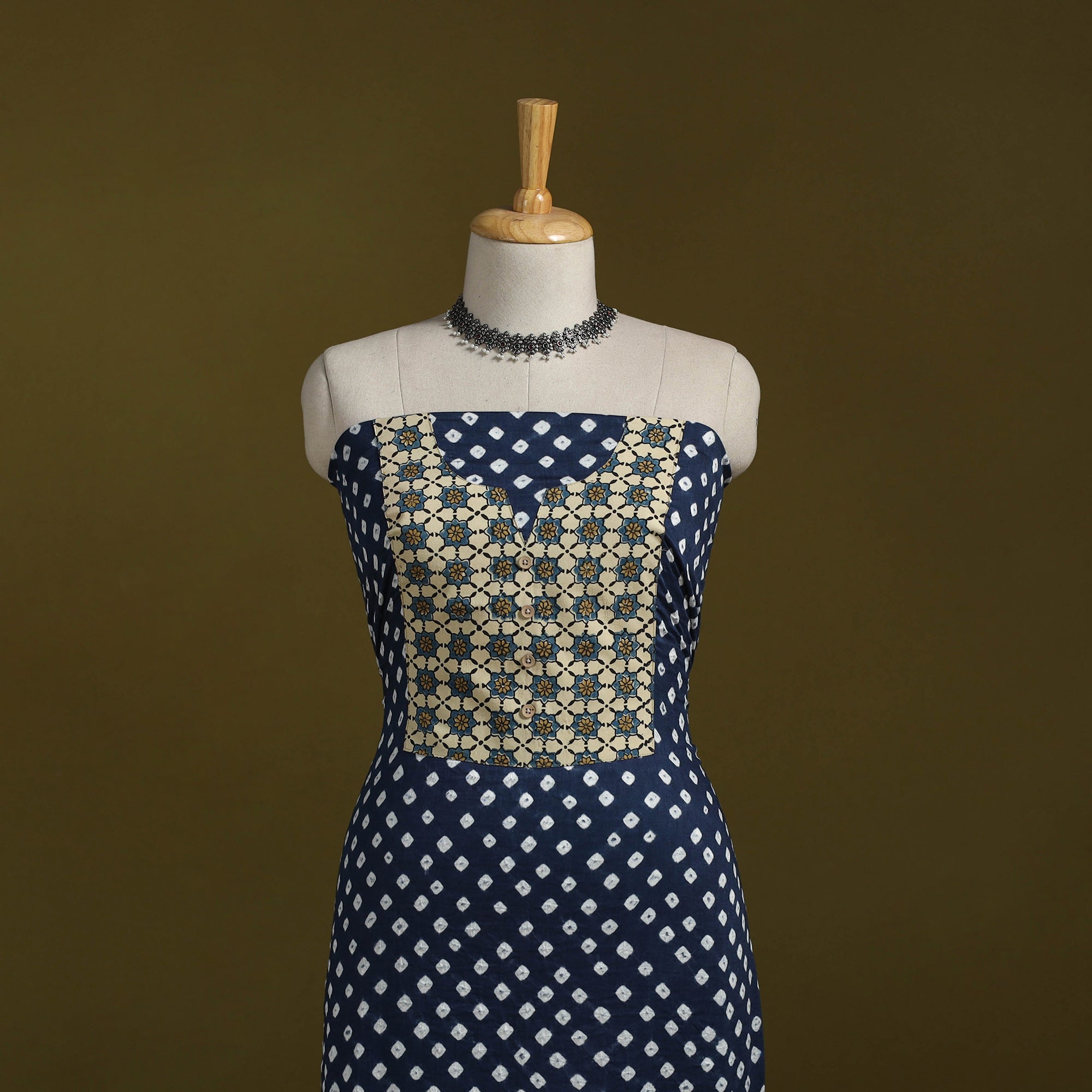 Bandhani cotton unstitched kurta material from Kutch. Made using traditional tie-dye technique, to create bandhej patterns. It features patchwork detailing, which adds a handcrafted touch. Ideal for stitching kurtas, fusion tops or tunics.