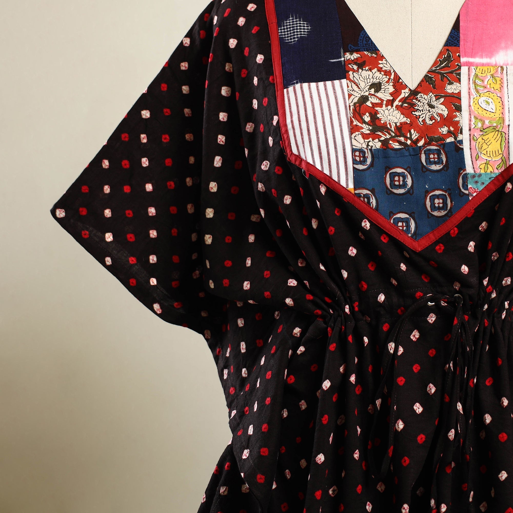 Enjoy effortless comfort in this maroon bandhani tie-dye patchwork kaftan. Made from soft, breathable cotton, it features a drawstring waist for an adjustable fit. Perfect for lounging at home or stepping out for casual outings, this kaftan offers a relaxed feel with just the right touch of style.