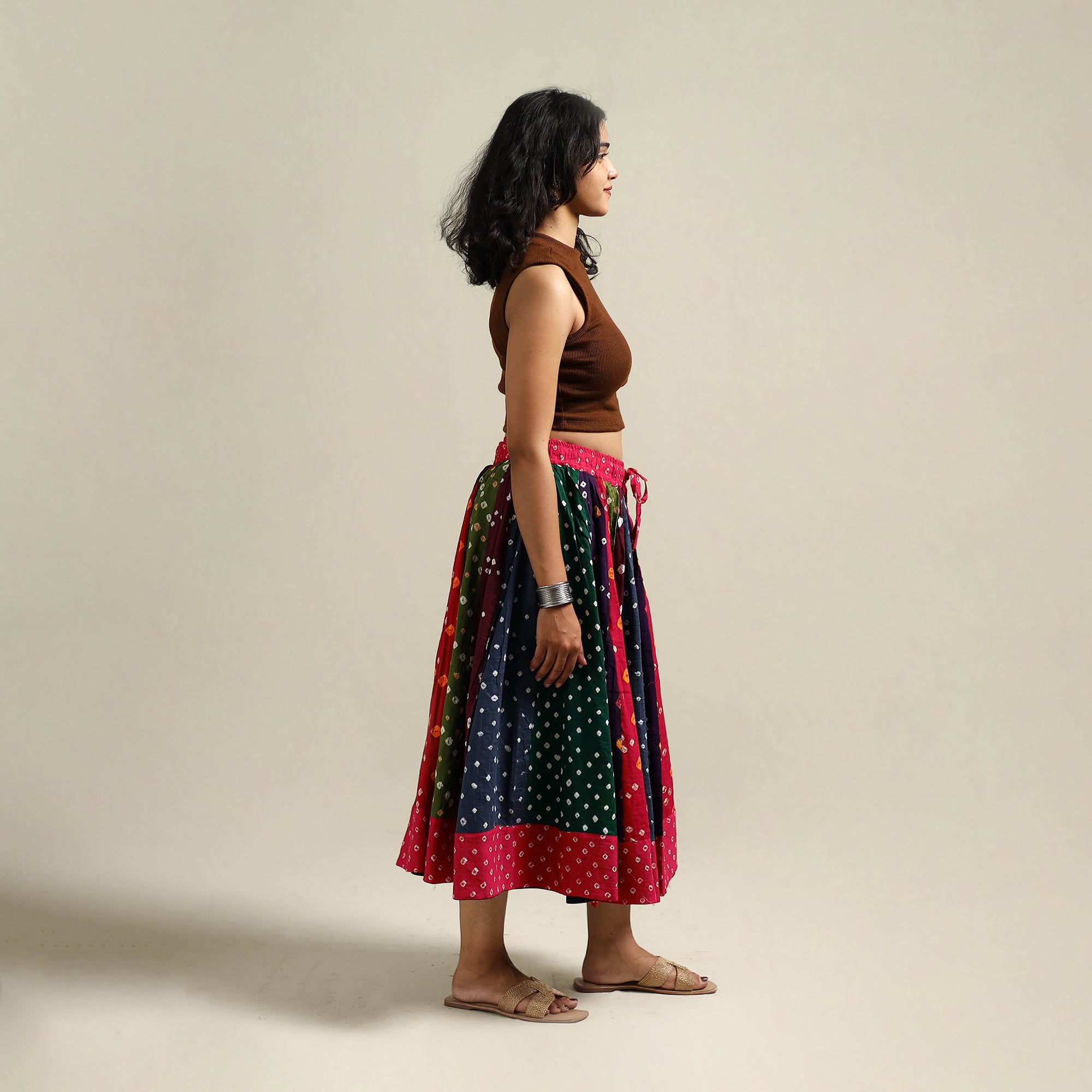 Patchwork cotton skirt with bandhani tie-dye patterns, crafted by skilled artisans.