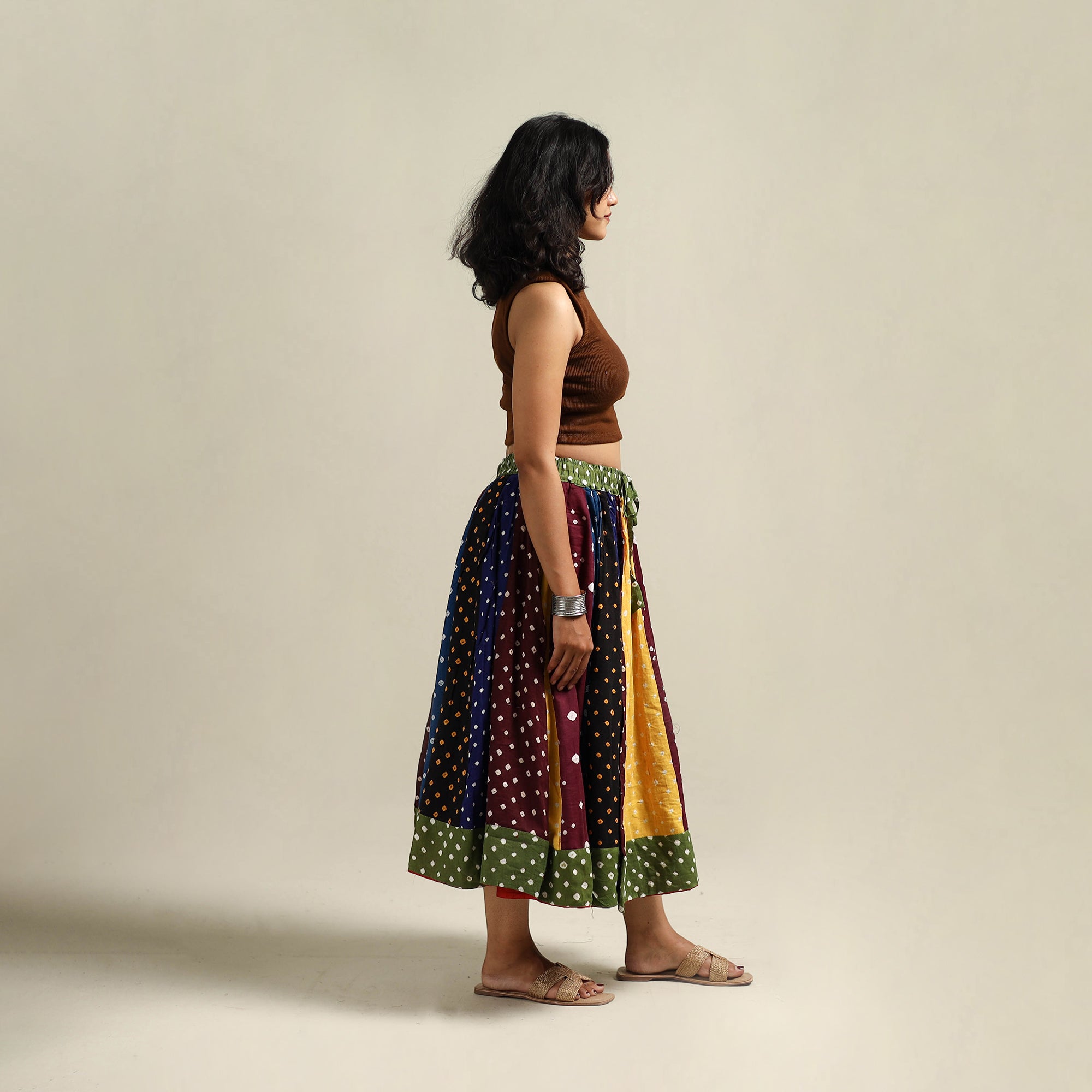 Patchwork cotton skirt with bandhani tie-dye patterns, crafted by skilled artisans.
