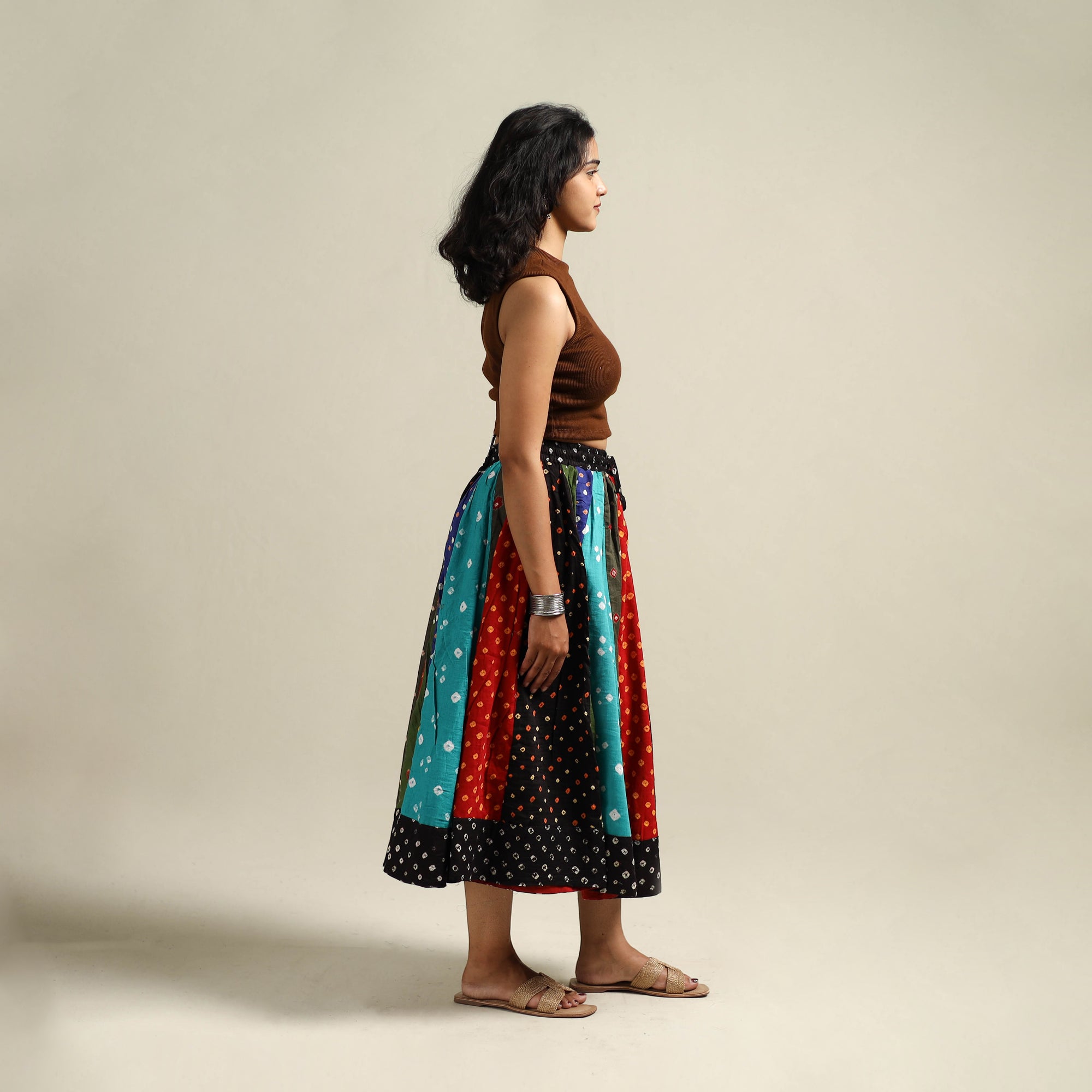 Patchwork cotton skirt with bandhani tie-dye patterns, crafted by skilled artisans.