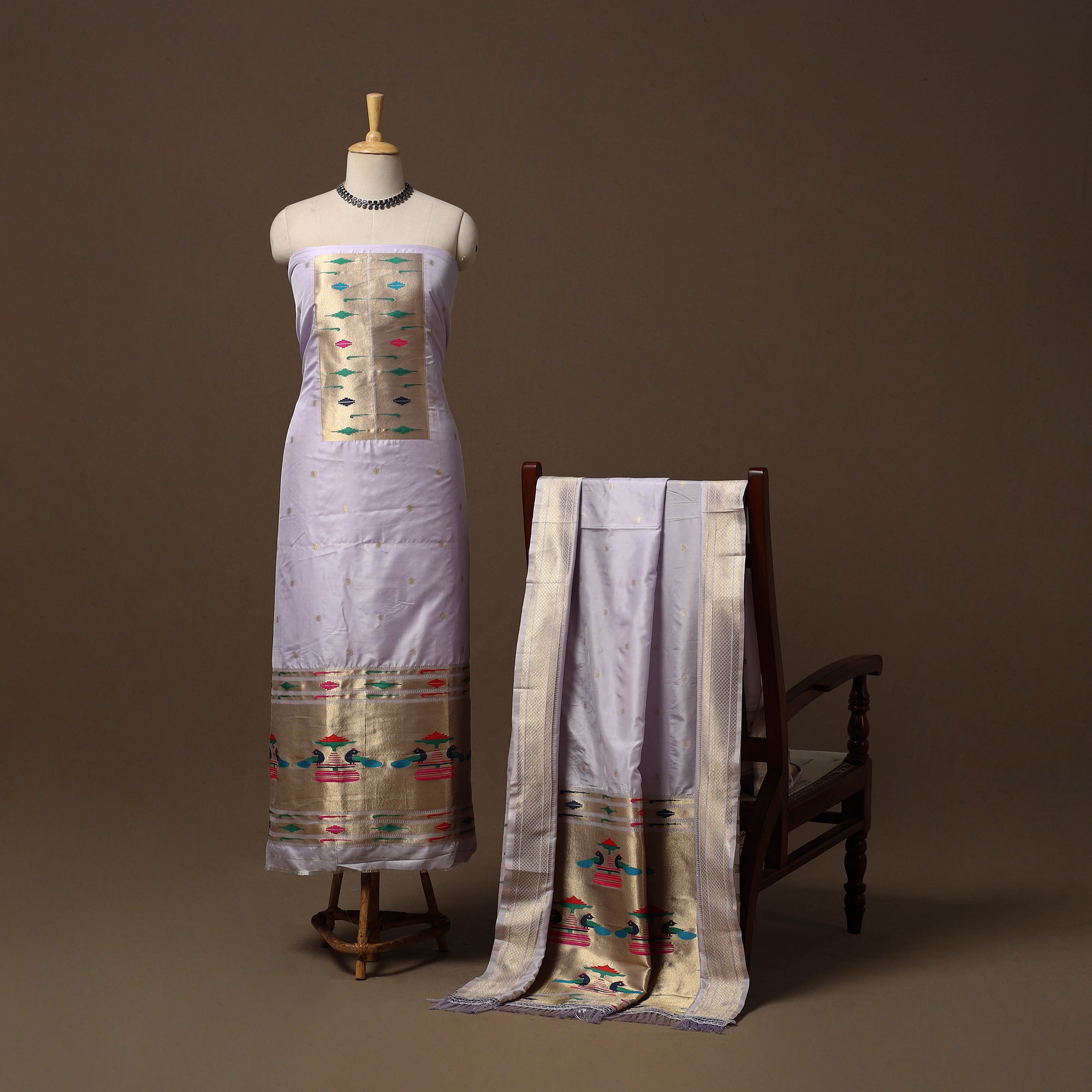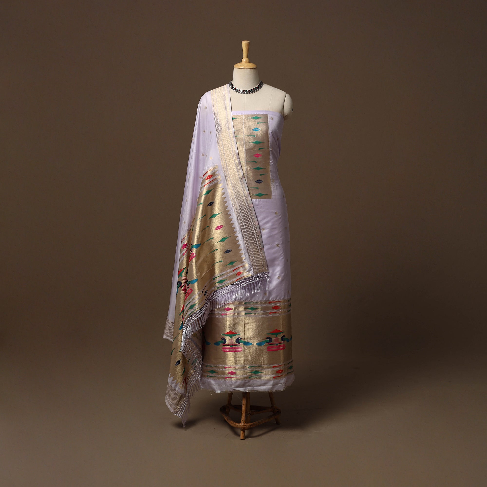 Bangalore silk paithani 3pc unstitched dress material features rich zari work with beautiful peacock, lotus and traditional motifs. The set includes a kurta, dupatta and bottom. Its vibrant colors and detailed patterns add an elegant touch, while the smooth silk fabric gives it a royal look. Perfect for weddings, festive events and special occasions.