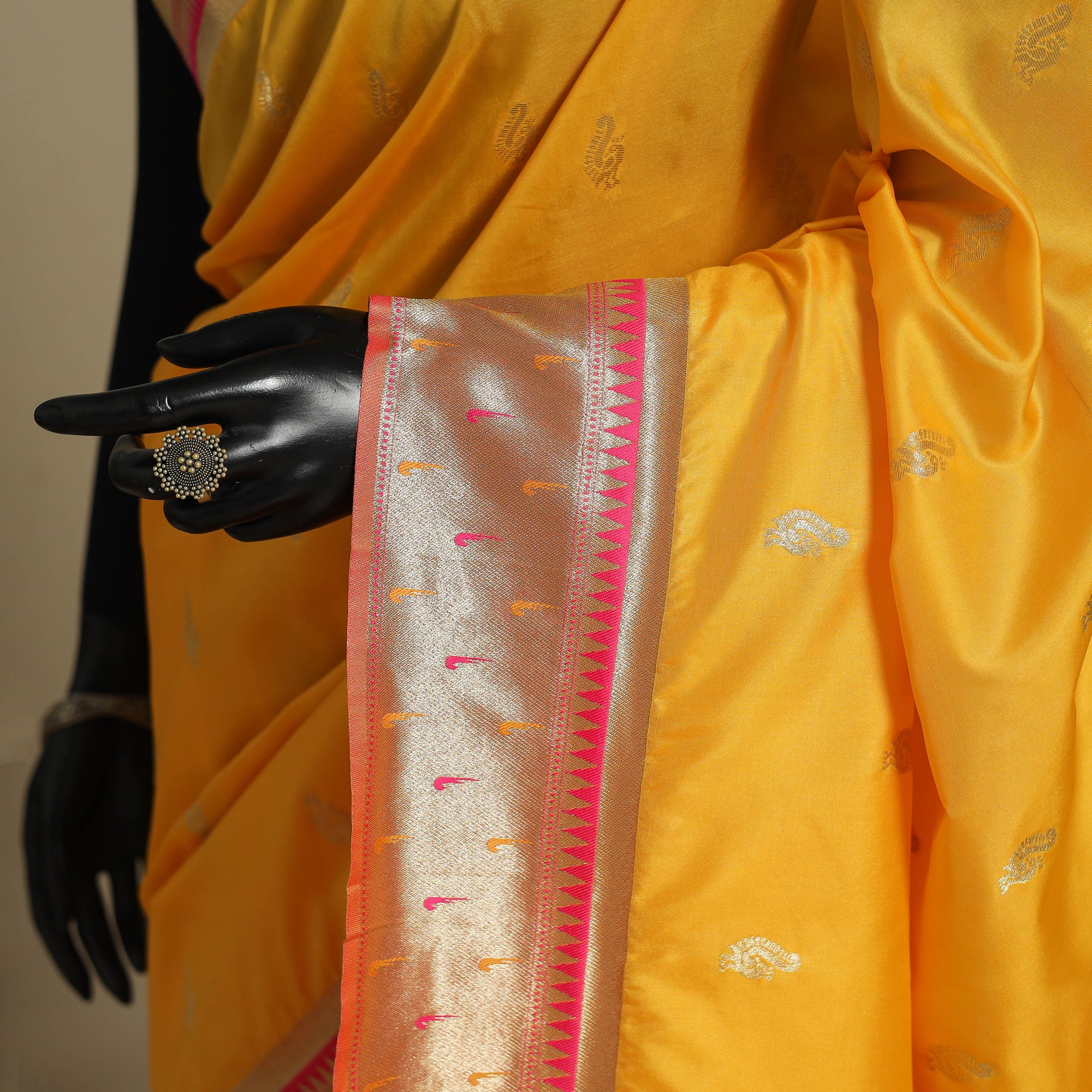 This yellow bangalore silk paithani saree showcases exquisite zari weaving with gold and silver threads. Adorned with traditional motifs like peacocks, lotuses, and designs inspired by mythological tales, it reflects cultural richness and elegance. The vibrant palette and intricate detailing make it truly striking, while the pure silk base adds a regal grace. An ideal choice for weddings, festive occasions, and grand celebrations.
