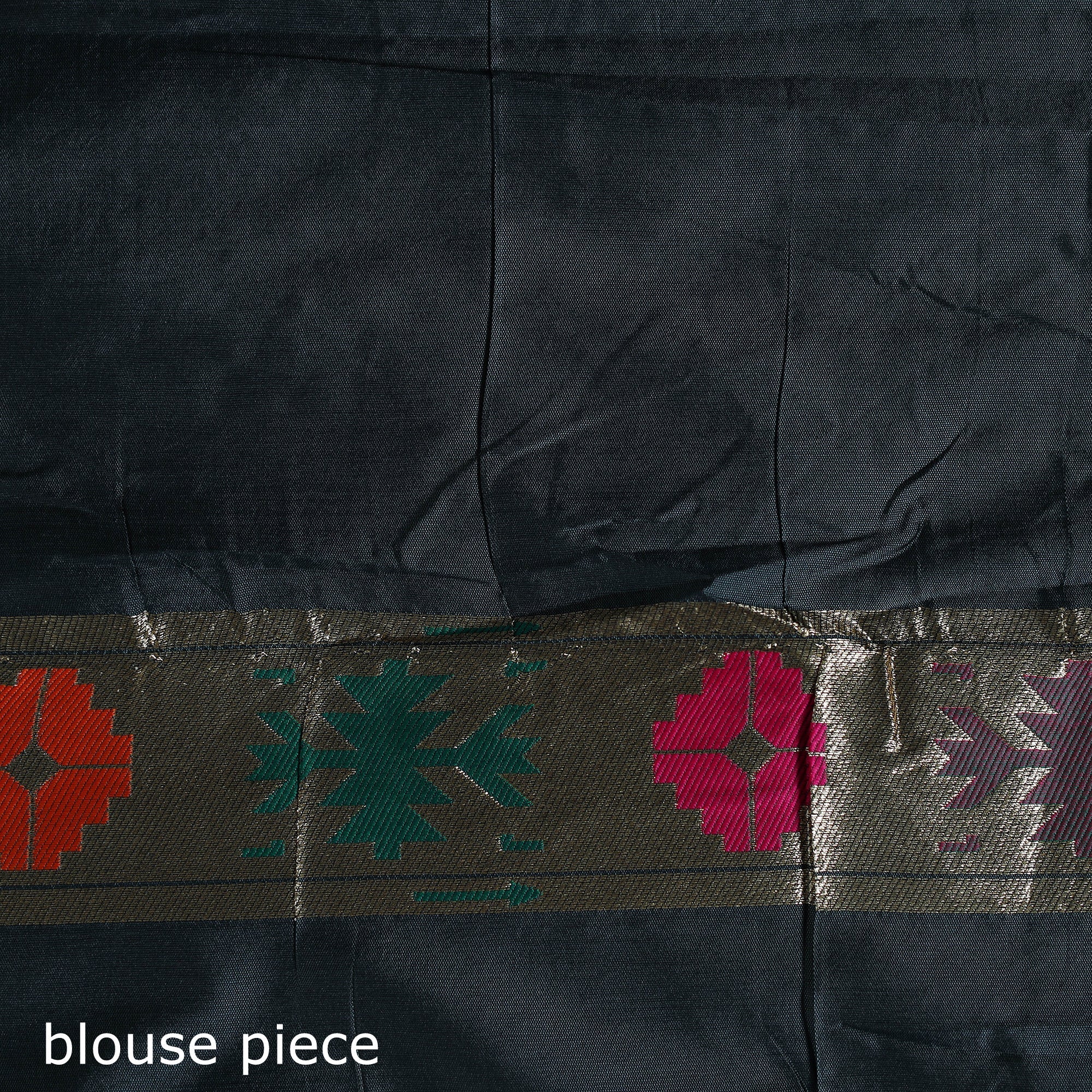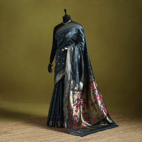 Grey bangalore silk paithani saree features exquisite zari weaving in gold and silver threads, showcasing traditional motifs like peacocks and lotuses inspired by mythological tales. Its vibrant colors and intricate detailing reflect cultural richness and timeless elegance. Crafted on a bangalore silk base, it exudes regal charm, making it a perfect choice for weddings, occasions and celebrations.