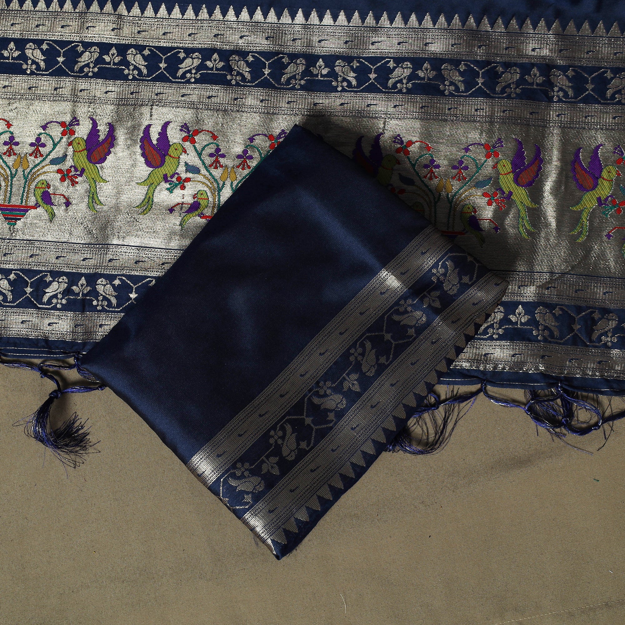 • Blue - Bangalore Silk Paithani Weave 3pc Unstitched Dress Material Suit Set 07