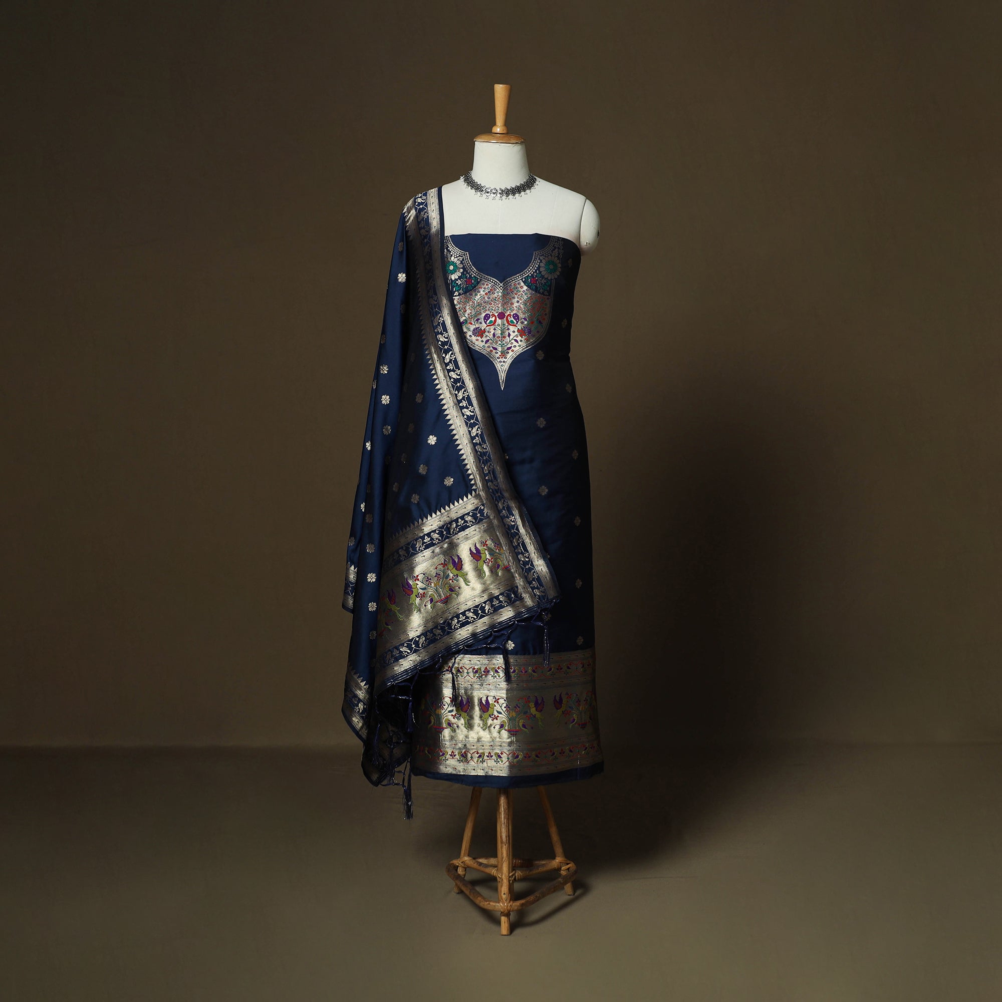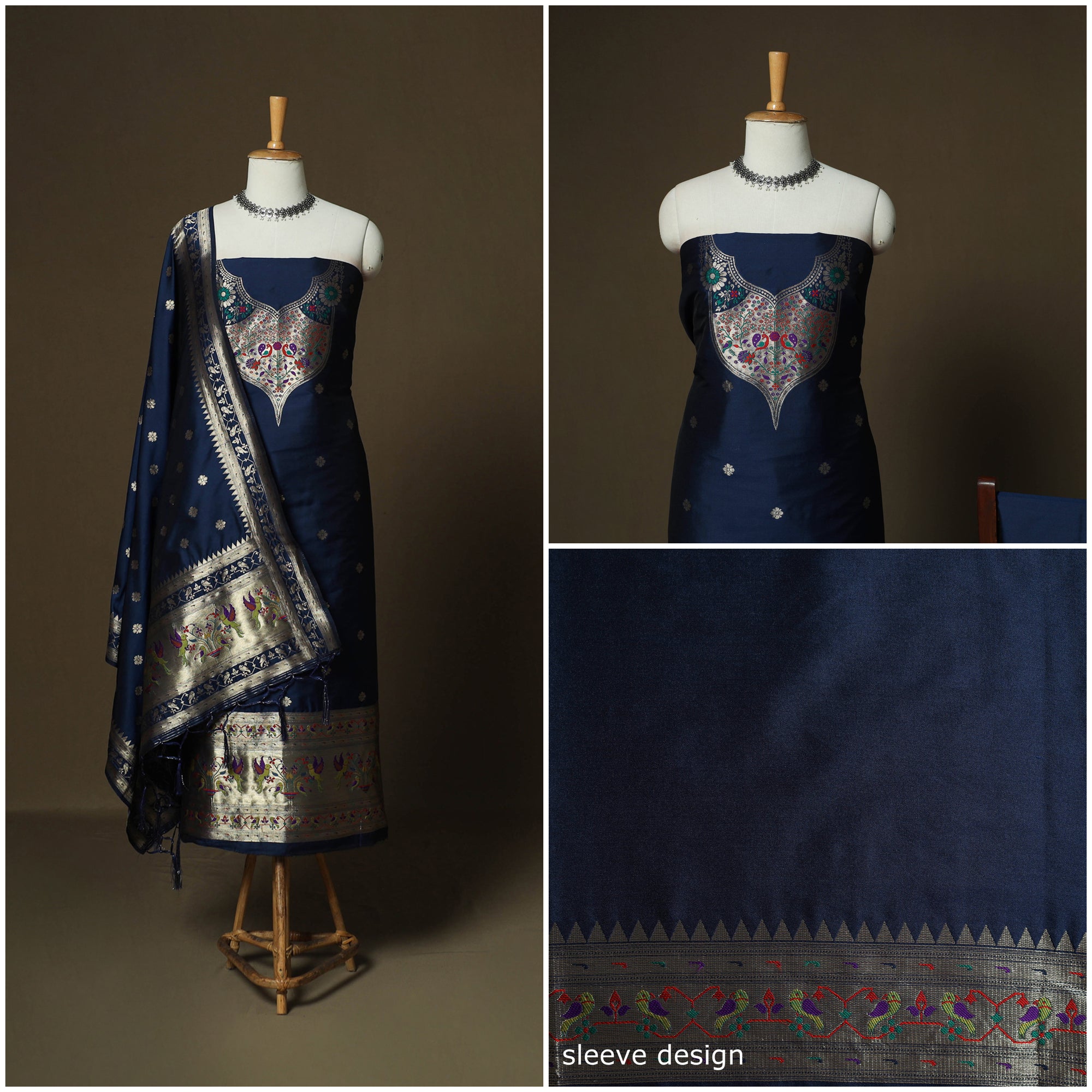 Blue paithani weave 3pc bangalore silk unstitched dress material suit set. Paithani is an ancient and treasured textile tradition from Maharashtra with a history that goes back over 2000 years. It is known for its intricate zari work and classic motifs like peacocks, lotuses and other traditional patterns. The set includes fabric for a kurta, dupatta and bottom, giving you the flexibility to stitch it as per your preferred style and fit. The smooth texture and subtle sheen of bangalore silk enhance the richness of its colors, making it a great choice for weddings, festive wear and special occasions.
