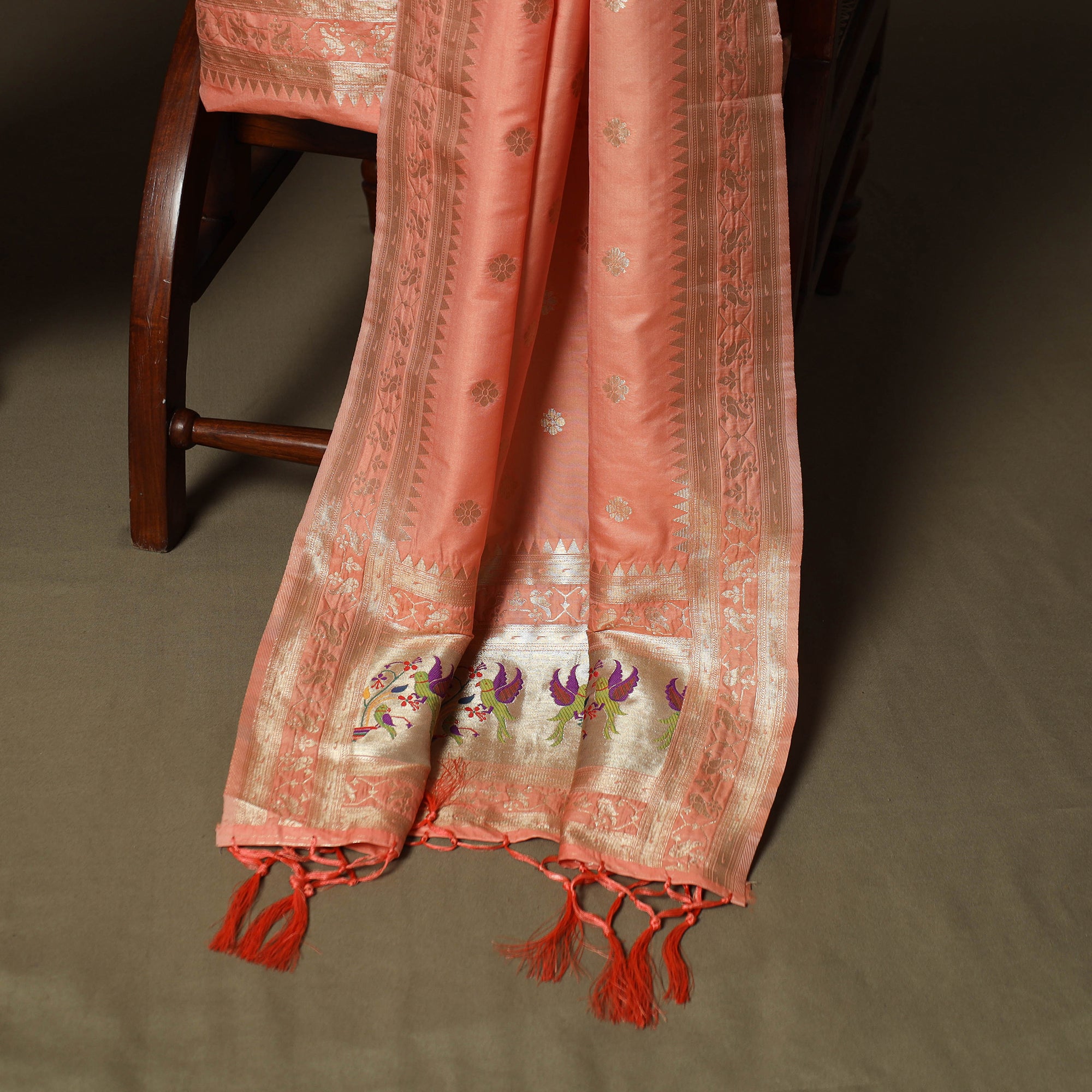 | Material | Peach paithani weave 3pc bangalore silk unstitched dress material suit set. Paithani is an ancient and treasured textile tradition from Maharashtra with a history that goes back over 2000 years. It is known for its intricate zari work and classic motifs like peacocks, lotuses and other traditional patterns. The set includes fabric for a kurta, dupatta and bottom, giving you the flexibility to stitch it as per your preferred style and fit. The smooth texture and subtle sheen of bangalore silk enhance the richness of its colors, making it a great choice for weddings, festive wear and special occasions. |
