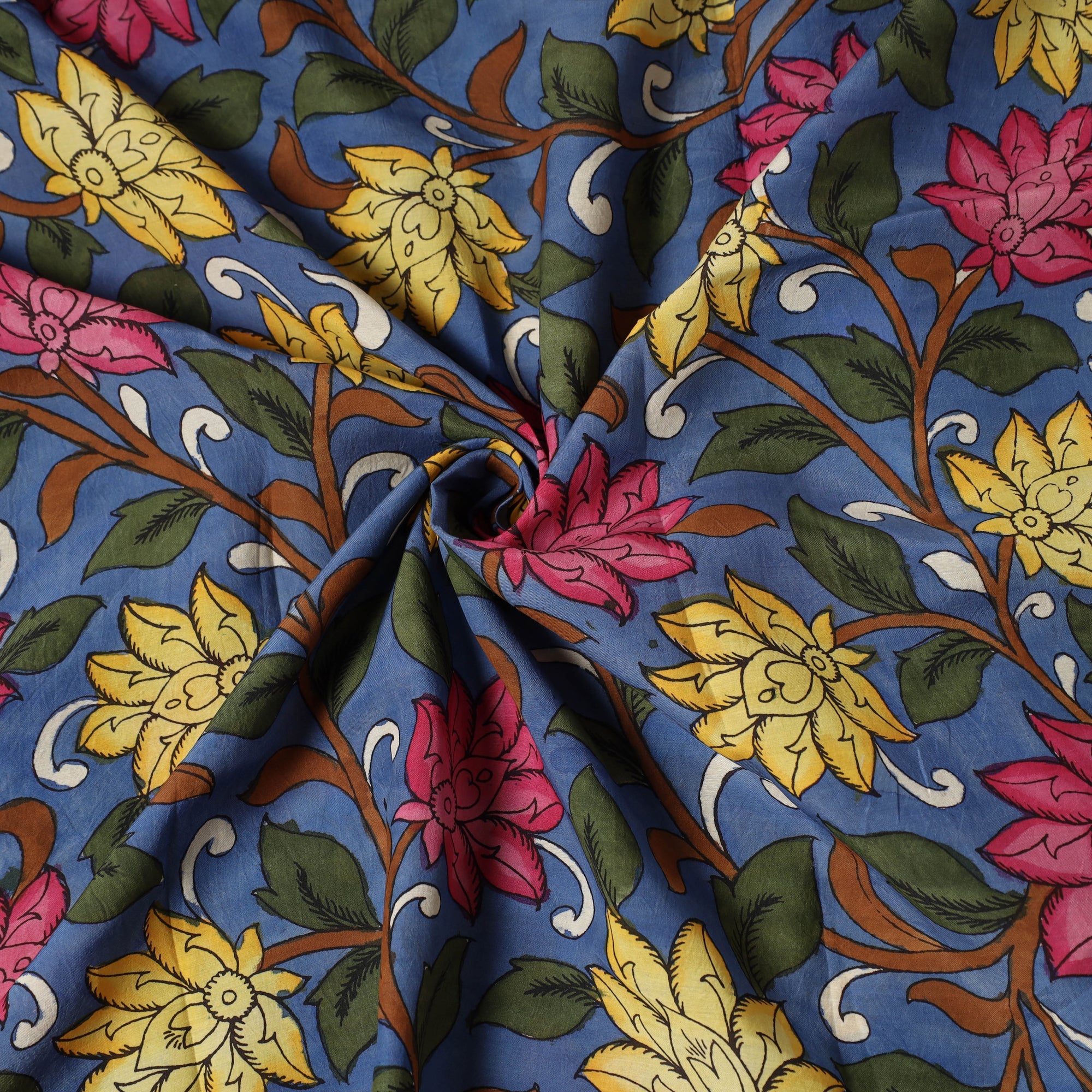 Experience the beauty of blue bangalore silk srikalahasti handpainted pen kalamkari fabric. This craft uses a kalam (pen) for freehand designs and natural dyes for vibrant, long-lasting colors. Each piece tells a unique story, reflecting the rich heritage of India’s artisans.