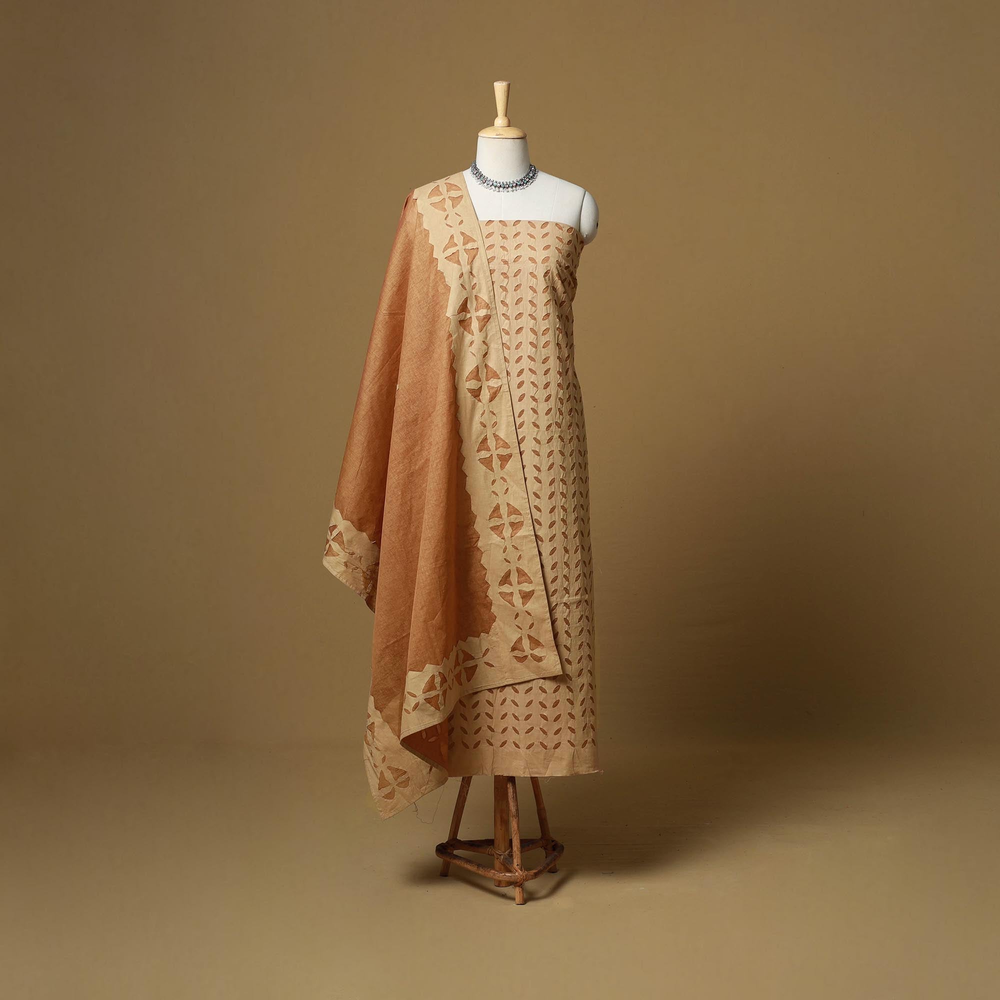 Beige 3pc cut work cotton applique dress material from barmer, rajasthan. Its unique style of applique work does magic in light and shade with beautiful stories and patterns. The set includes a plain matching bottom and a dupatta adorned with delicate applique designs.