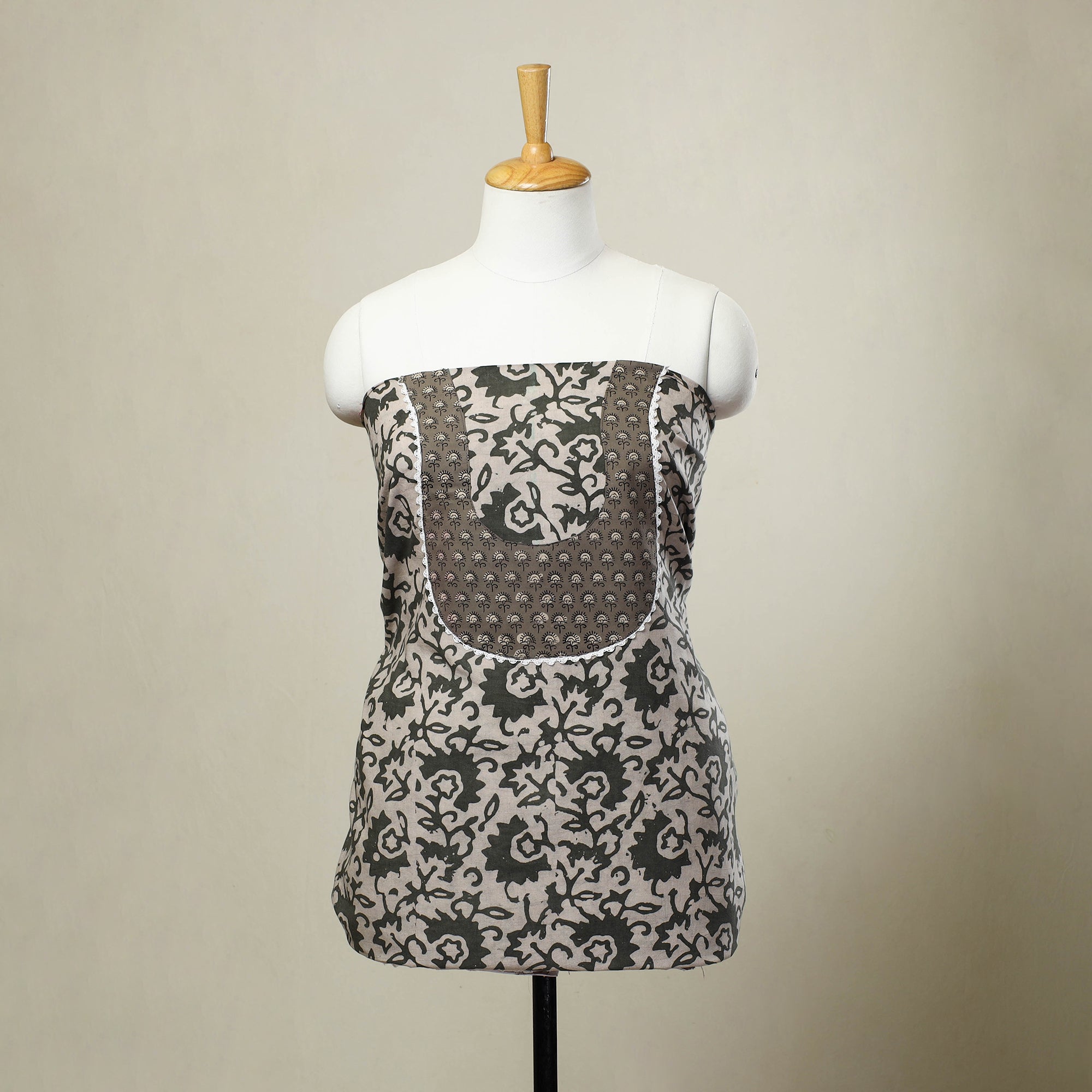 This beige batik block print patchwork cotton kurta material features vibrant designs created using the traditional wax-resist dyeing technique. Soft and breathable, it's perfect for custom kurtas, offering both comfort and cultural style.
