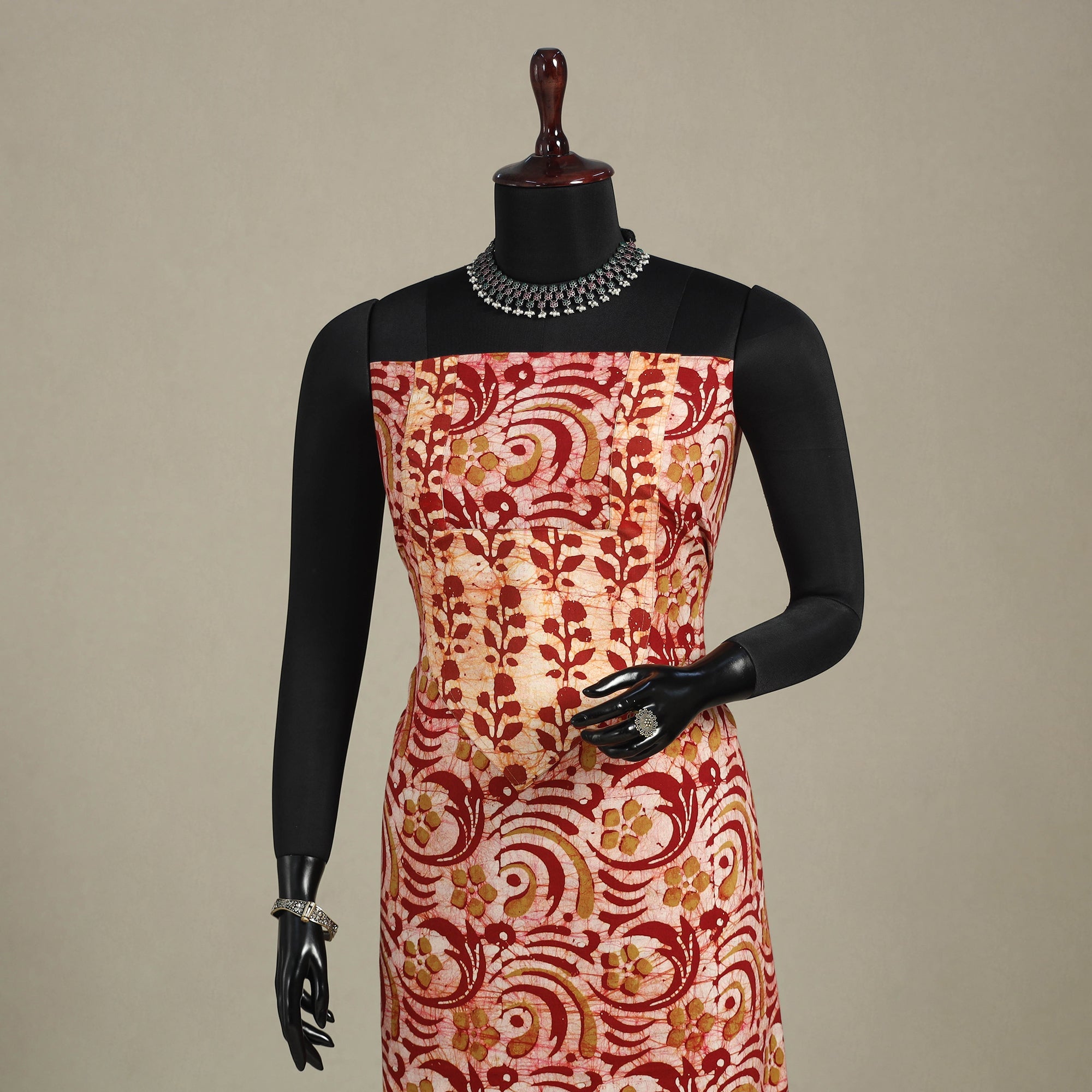 This red hand batik print patchwork cotton kurta material features vibrant designs created using the traditional wax-resist dyeing technique. Soft and breathable, it's perfect for custom kurtas, offering both comfort and cultural style.