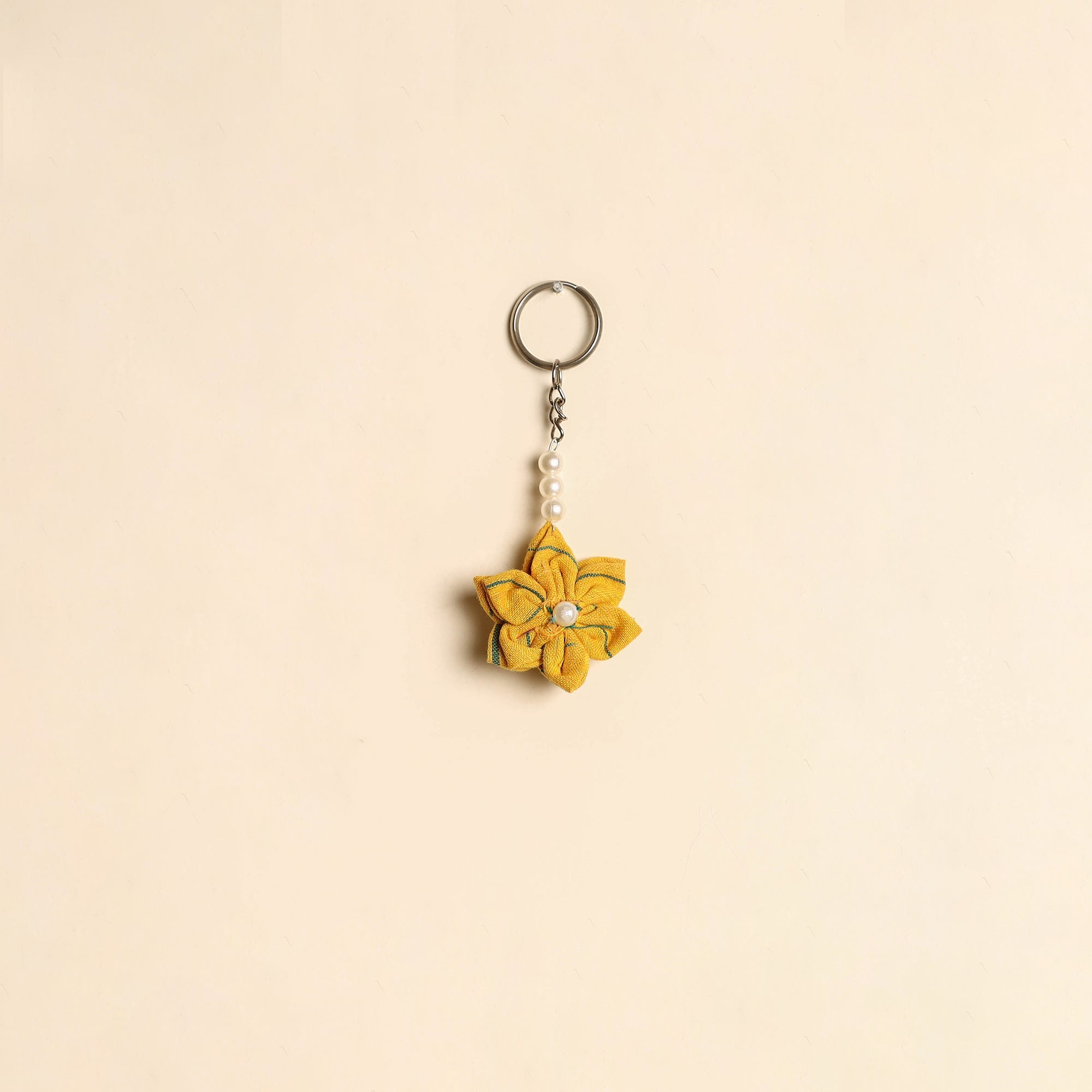 Handmade keychain crafted from cotton, featuring a charming fabart flower design with bead detailing. Lightweight and easy to carry, it adds a decorative touch to your keys, bags or pouches.