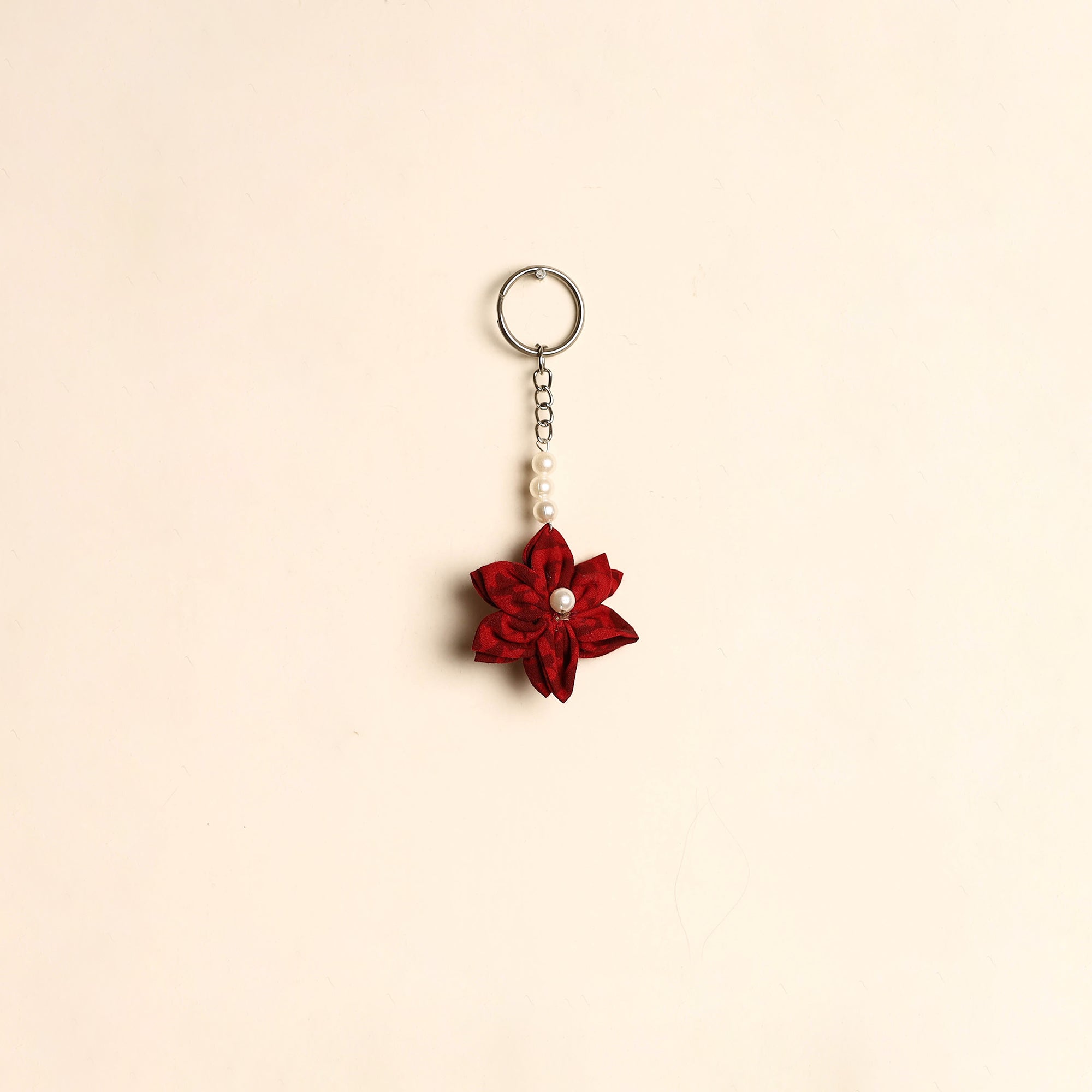 Handmade keychain crafted from cotton, featuring a charming fabart flower design with bead detailing. Lightweight and easy to carry, it adds a decorative touch to your keys, bags or pouches.