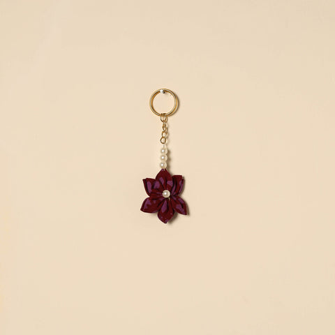 Maroon handmade keychain is crafted from leftover fabrics that were simply too pretty to waste. Sustainable and stylish, this keychain help reduce waste while adding a pop of personality to your daily routine. featuring a charming fabart flower design with beads detailing. It can be used to keep your keys organized or to add a decorative touch to your bags or pouches.