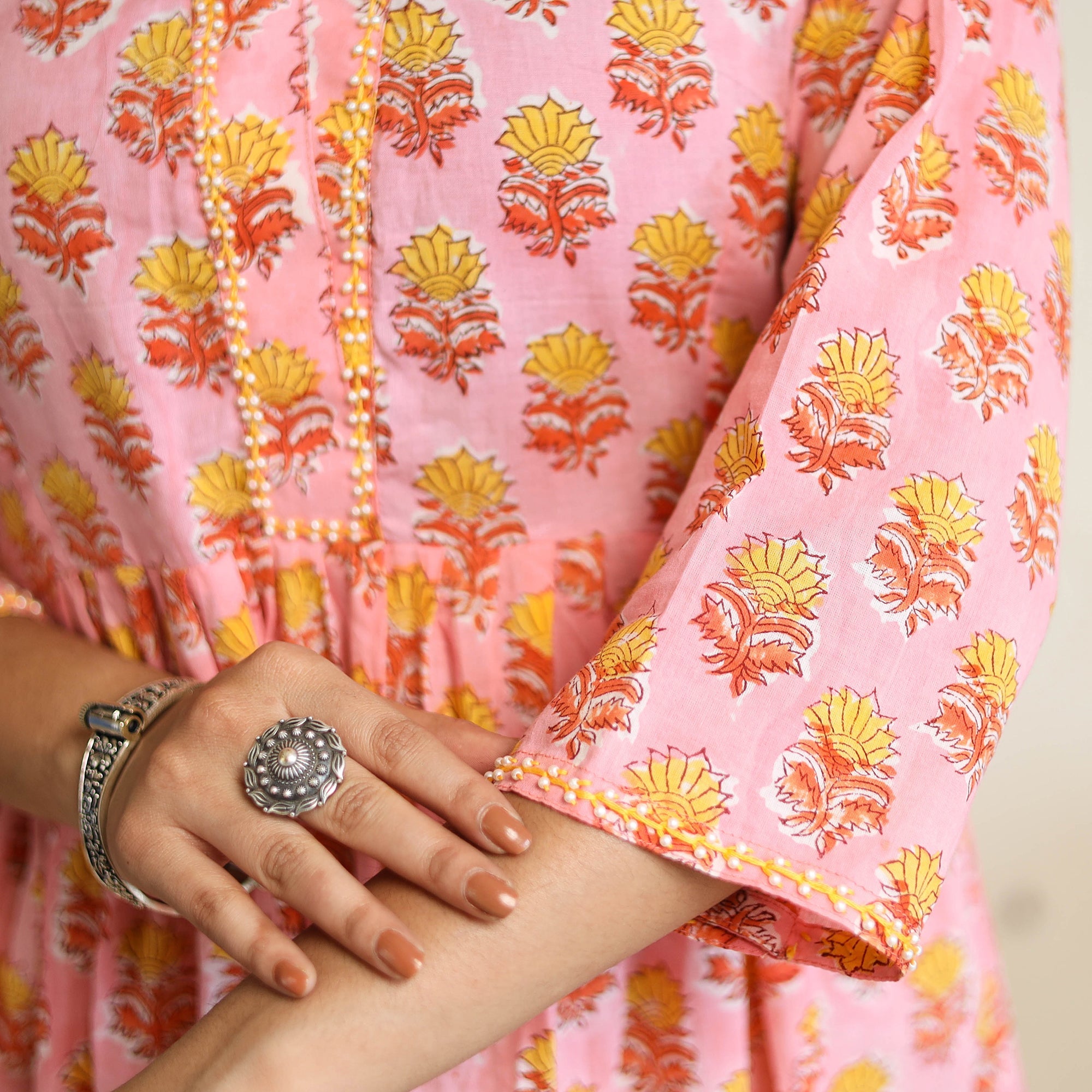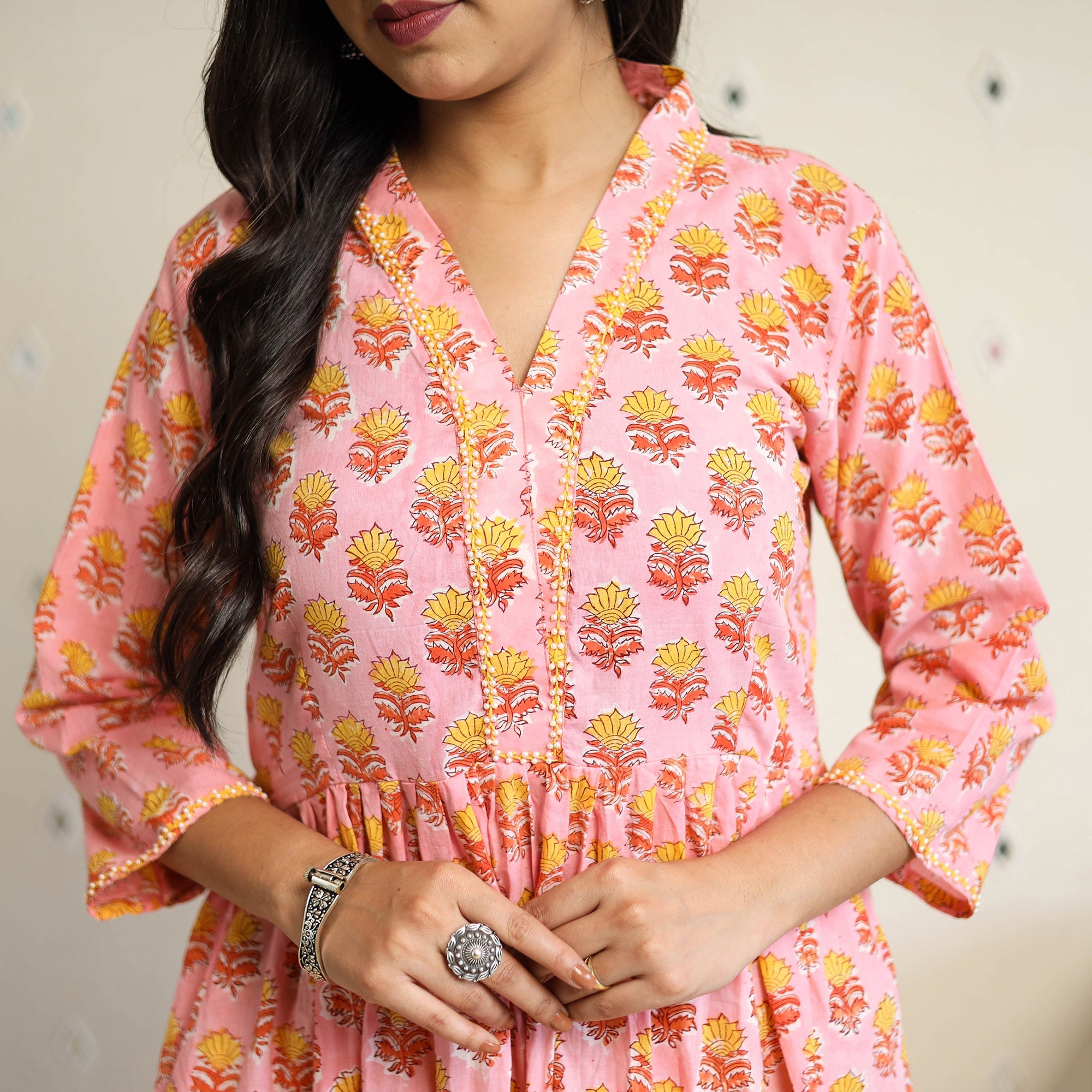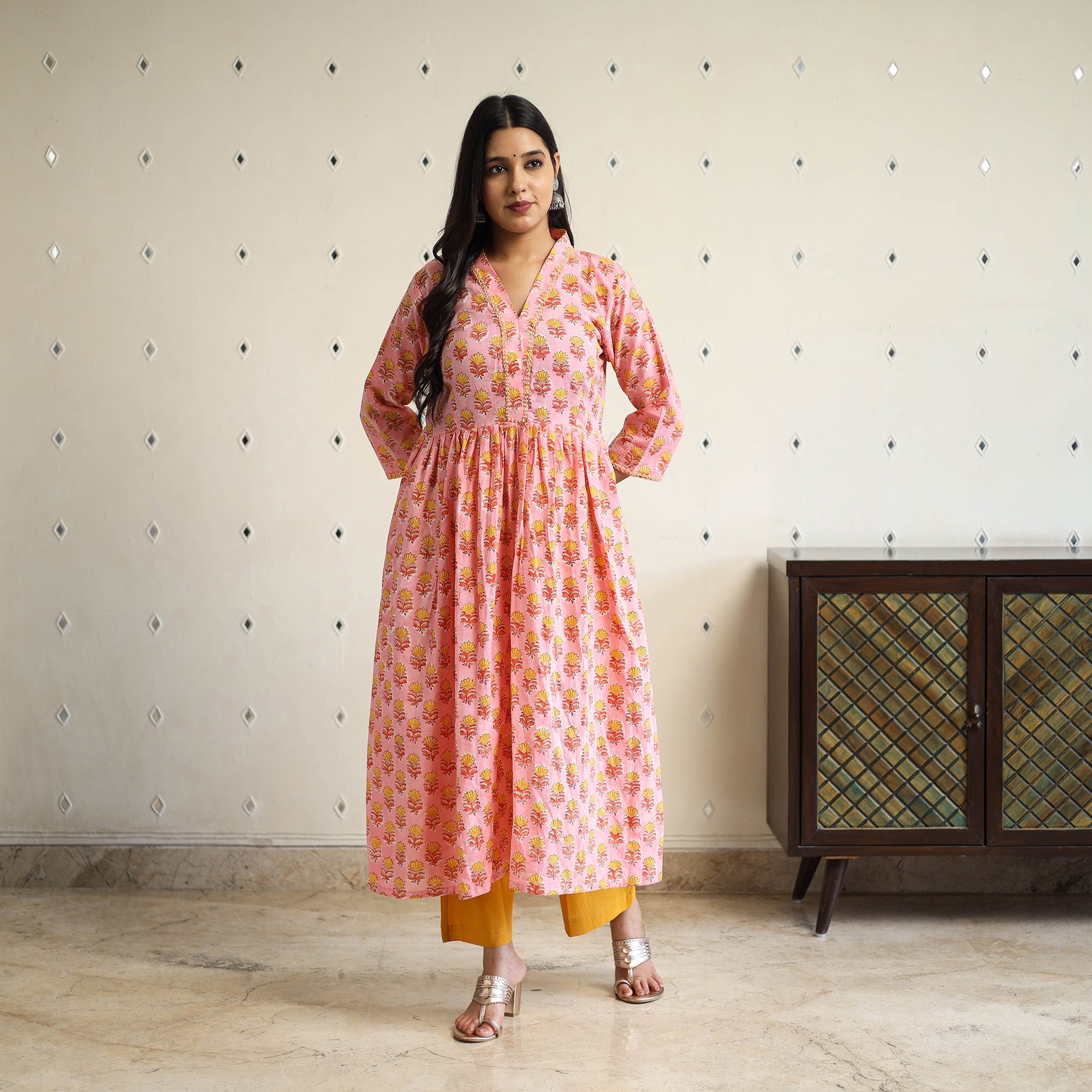 Embrace the beauty of tradition with this peach hand block printed sanganeri cotton flared kurta. Featuring delicate beadwork and a convenient side pocket, this kurta blends everyday comfort with elegant design. It is crafted by skilled artisans using block printing techniques and adds effortless charm to both regular days and special celebrations.