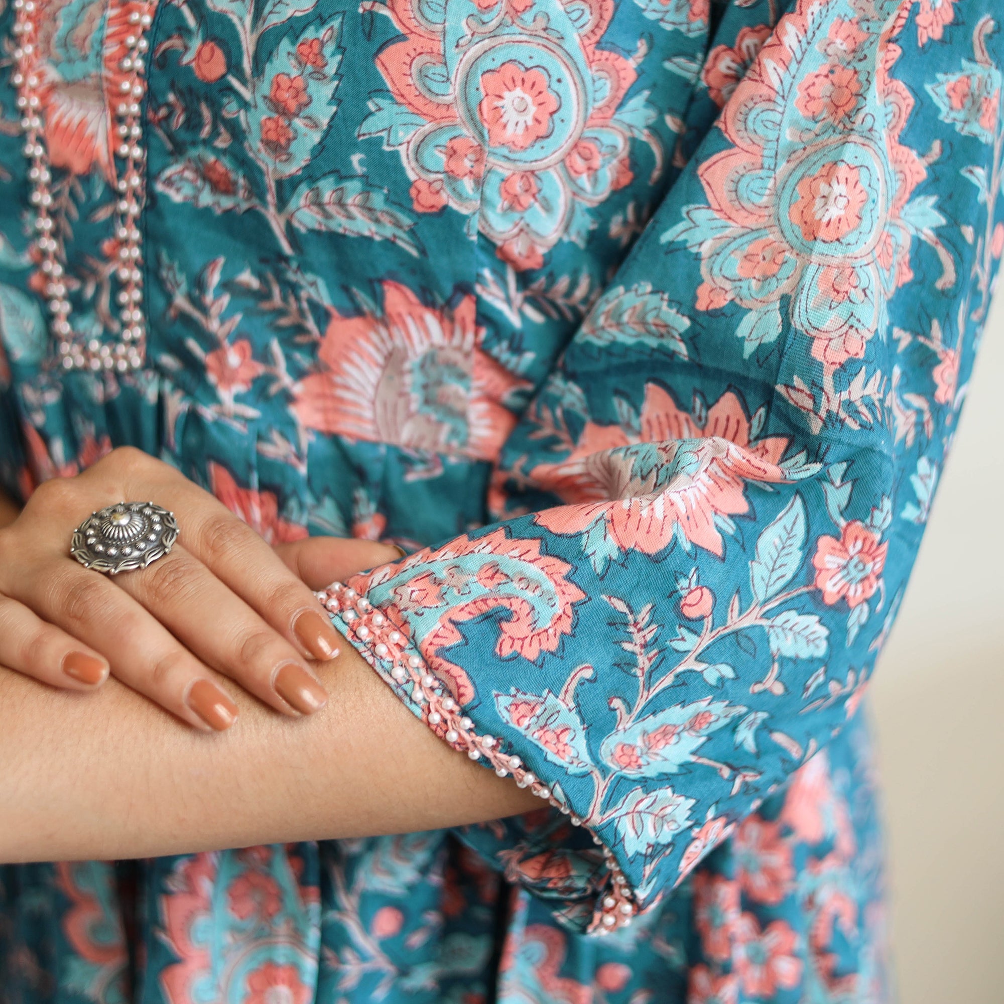 Embrace the beauty of tradition with this green hand block printed sanganeri cotton flared kurta. Featuring delicate beadwork and a convenient side pocket, this kurta blends everyday comfort with elegant design. It is crafted by skilled artisans using block printing techniques and adds effortless charm to both regular days and special celebrations.
