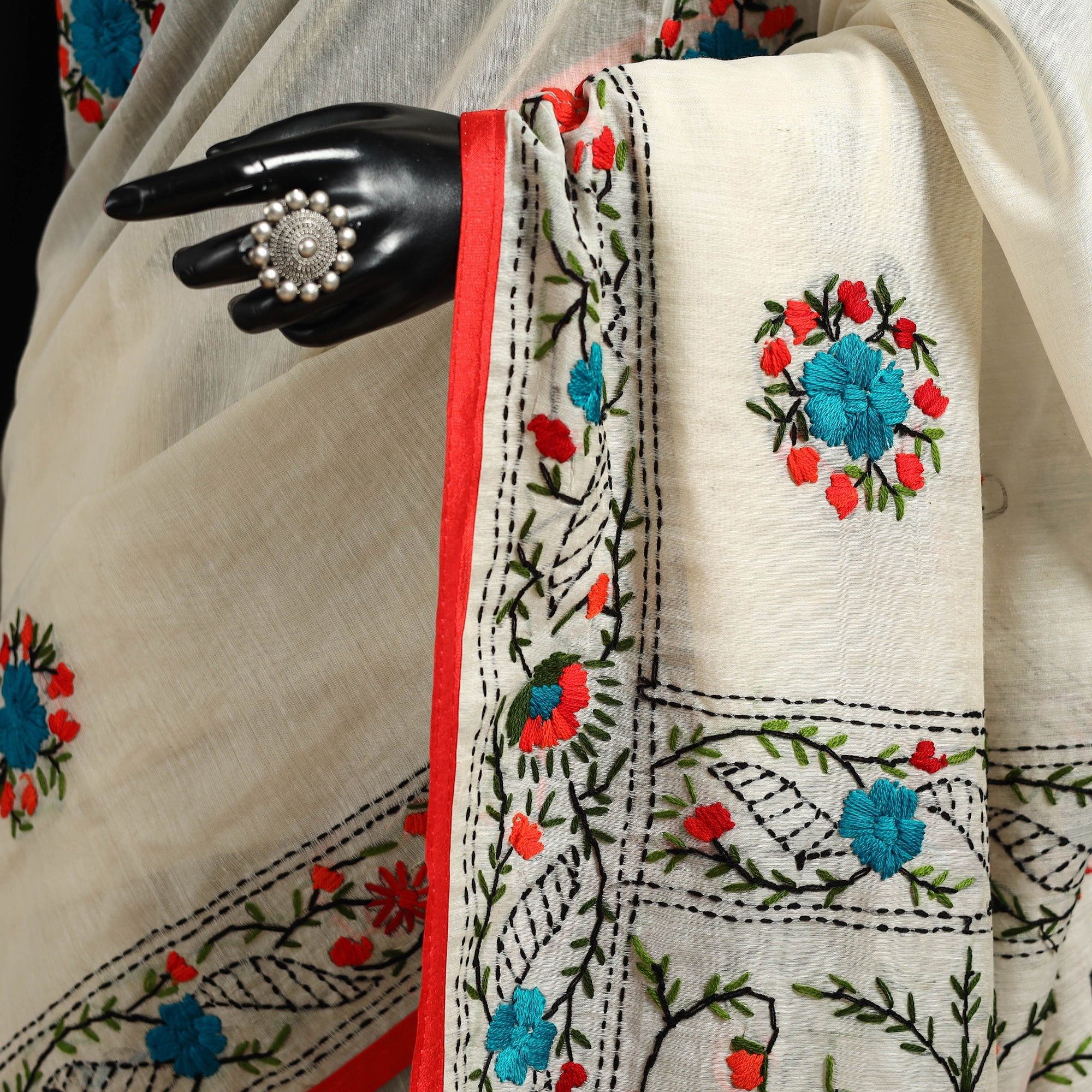 Add a touch of grace to your wardrobe with this white bengal chanderi silk cotton saree featuring beautiful embroidery. Crafted by skilled artisans from West Bengal, this saree highlights fine threadwork that enhances the soft sheen of chanderi silk cotton. Each motif is carefully hand-embroidered, making it perfect for festive or elegant occasions.
