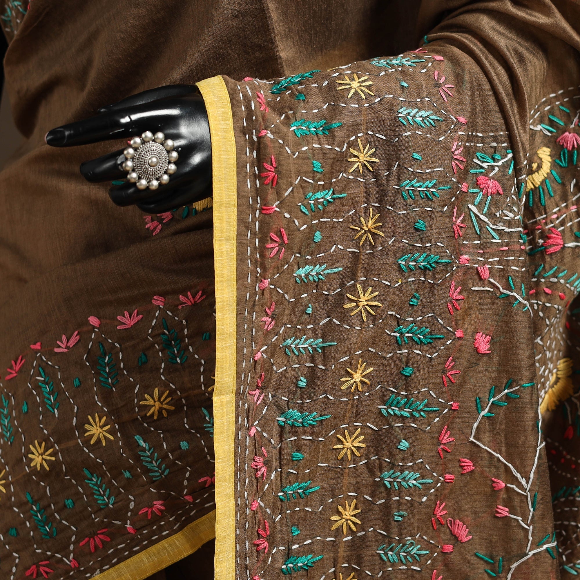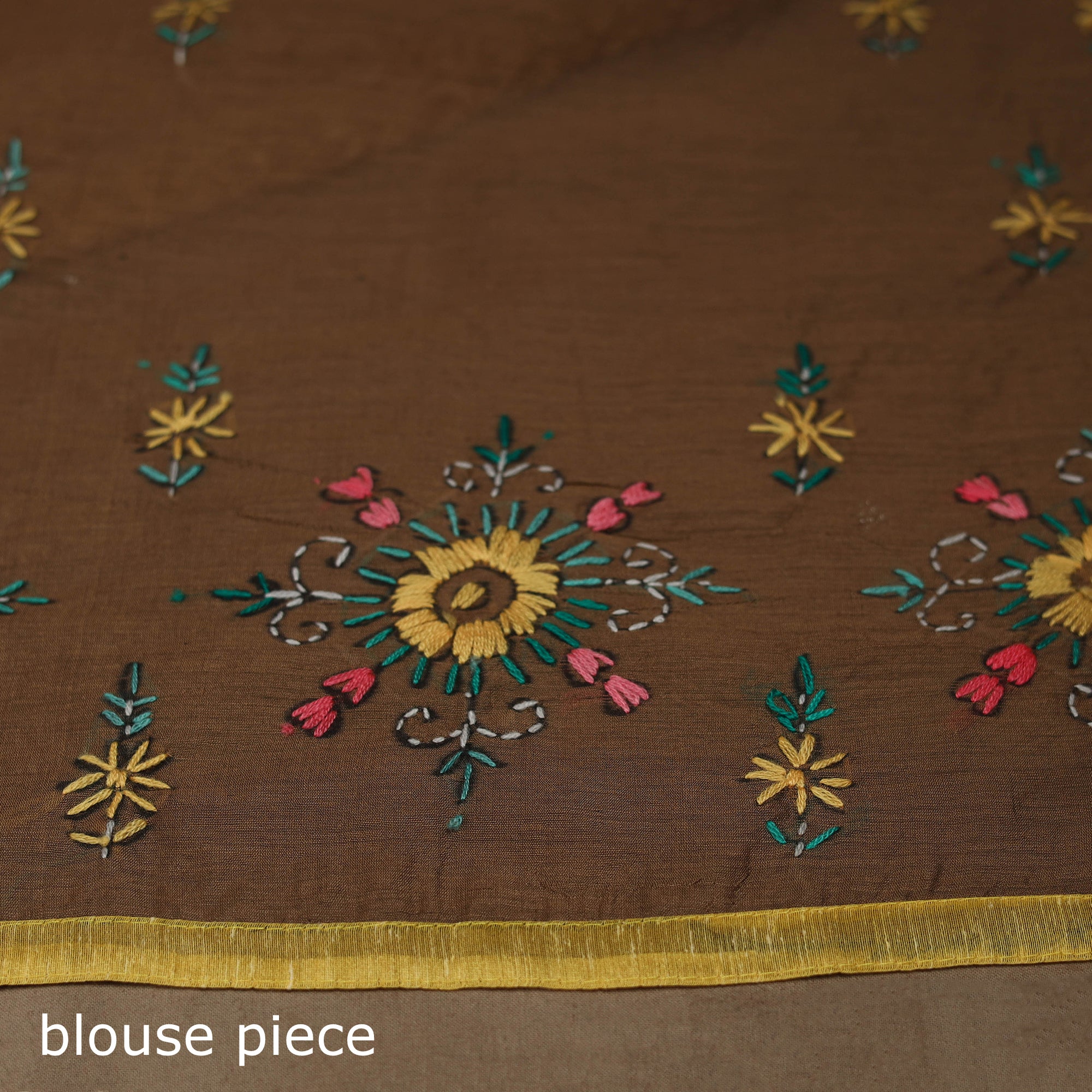 Add a touch of grace to your wardrobe with this brown bengal chanderi silk cotton saree featuring beautiful embroidery. Crafted by skilled artisans from West Bengal, this saree highlights fine threadwork that enhances the soft sheen of chanderi silk cotton. Each motif is carefully hand-embroidered, making it perfect for festive or elegant occasions.