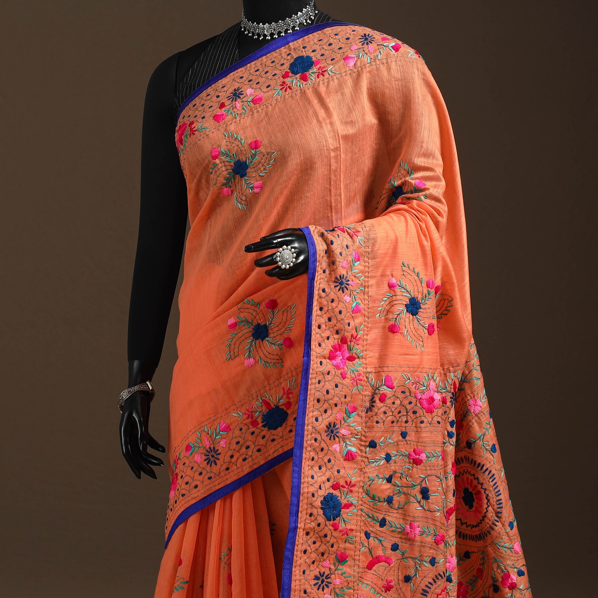 Add a touch of grace to your wardrobe with this orange bengal chanderi silk cotton saree featuring beautiful embroidery. Crafted by skilled artisans from West Bengal, this saree highlights fine threadwork that enhances the soft sheen of chanderi silk cotton. Each motif is carefully hand-embroidered, making it perfect for festive or elegant occasions.