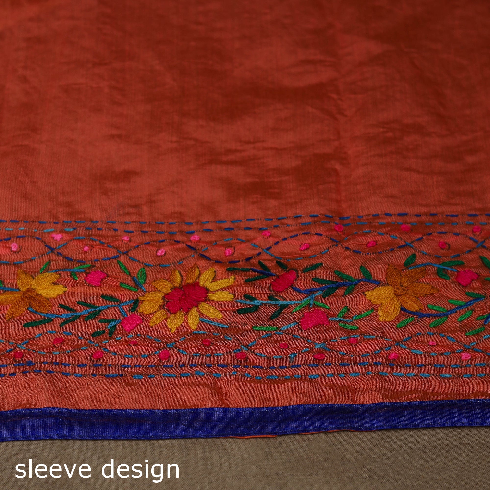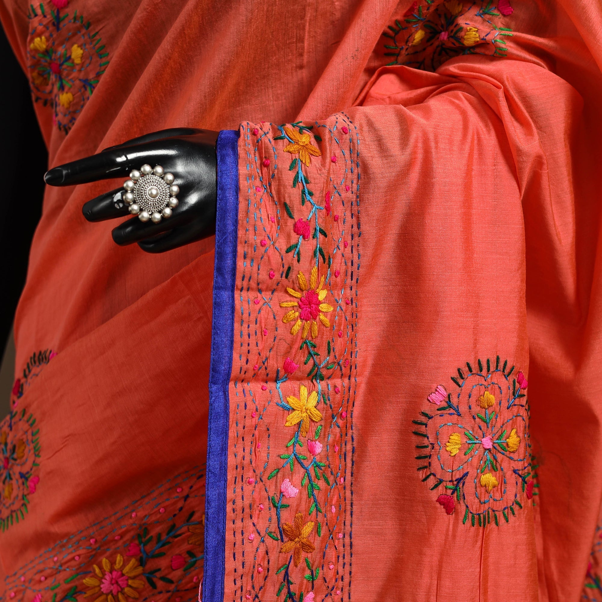 Add a touch of grace to your wardrobe with this orange bengal chanderi silk cotton saree featuring beautiful embroidery. Crafted by skilled artisans from West Bengal, this saree highlights fine threadwork that enhances the soft sheen of chanderi silk cotton. Each motif is carefully hand-embroidered, making it perfect for festive or elegant occasions.