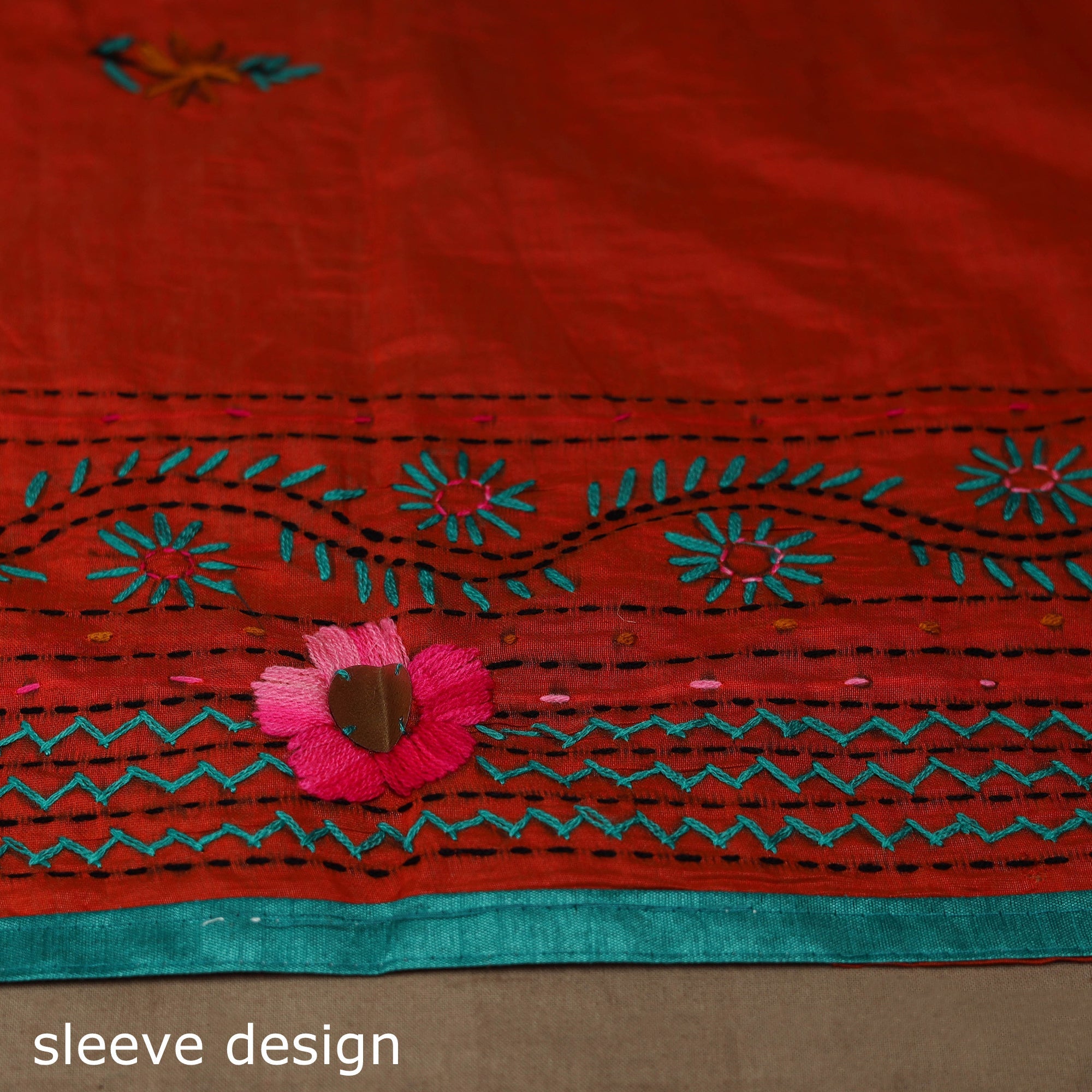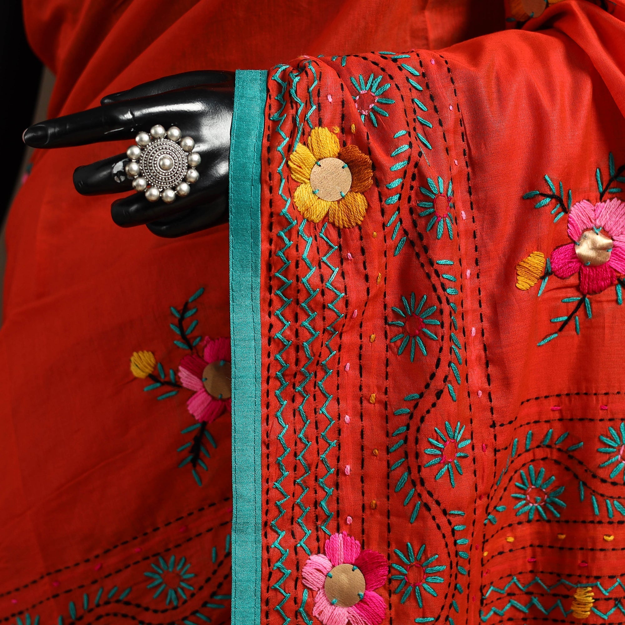 Add a touch of grace to your wardrobe with this red bengal chanderi silk cotton saree featuring beautiful embroidery. Crafted by skilled artisans from West Bengal, this saree highlights fine threadwork that enhances the soft sheen of chanderi silk cotton. Each motif is carefully hand-embroidered, making it perfect for festive or elegant occasions.