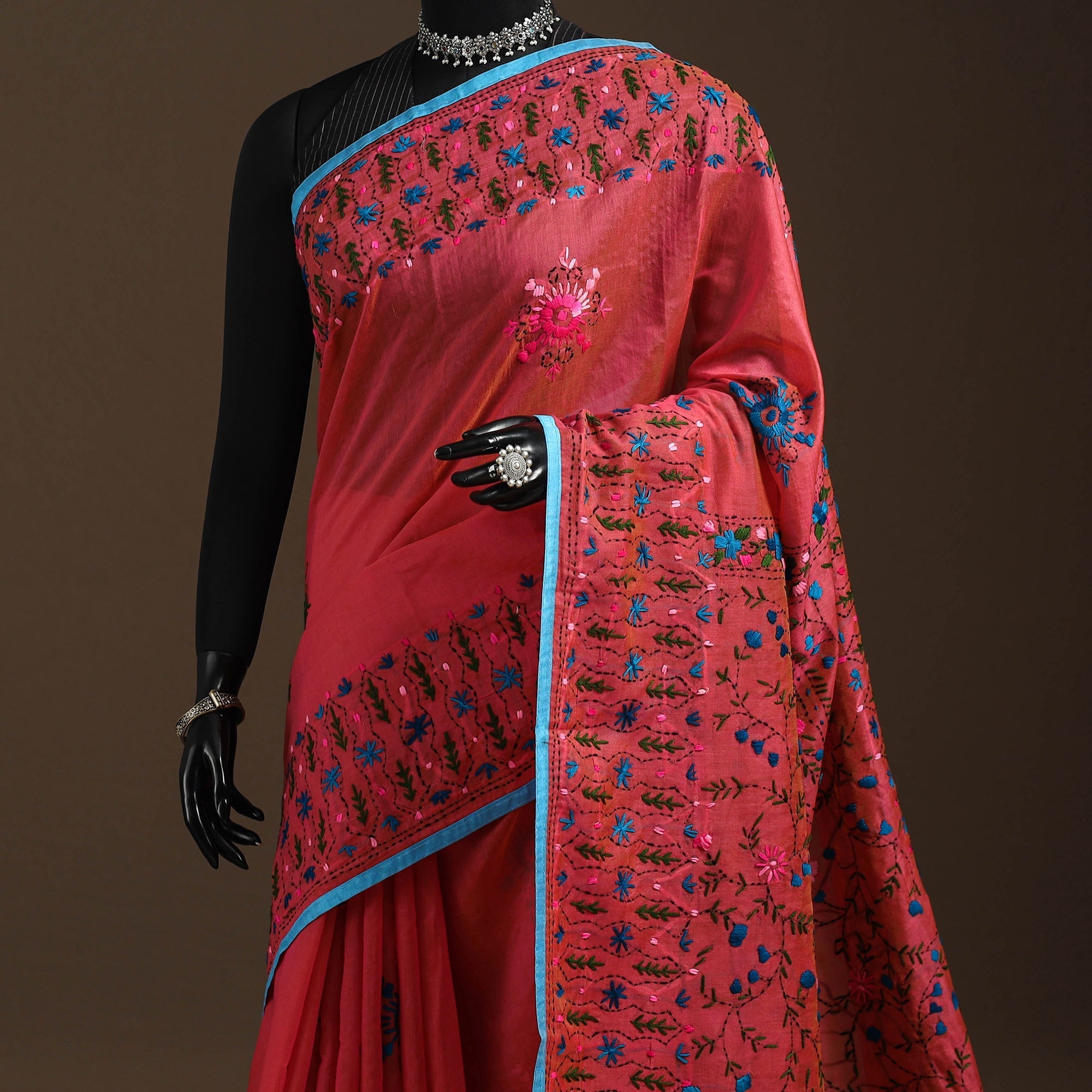 Add a touch of grace to your wardrobe with this pink bengal chanderi silk cotton saree featuring beautiful embroidery. Crafted by skilled artisans from West Bengal, this saree highlights fine threadwork that enhances the soft sheen of chanderi silk cotton. Each motif is carefully hand-embroidered, making it perfect for festive or elegant occasions.