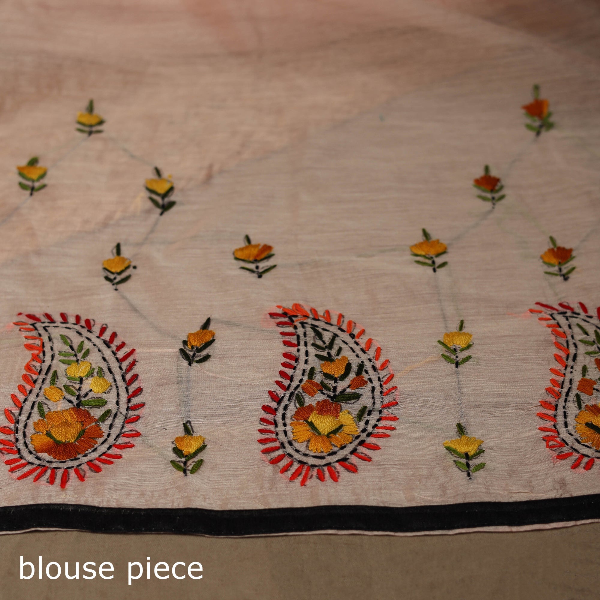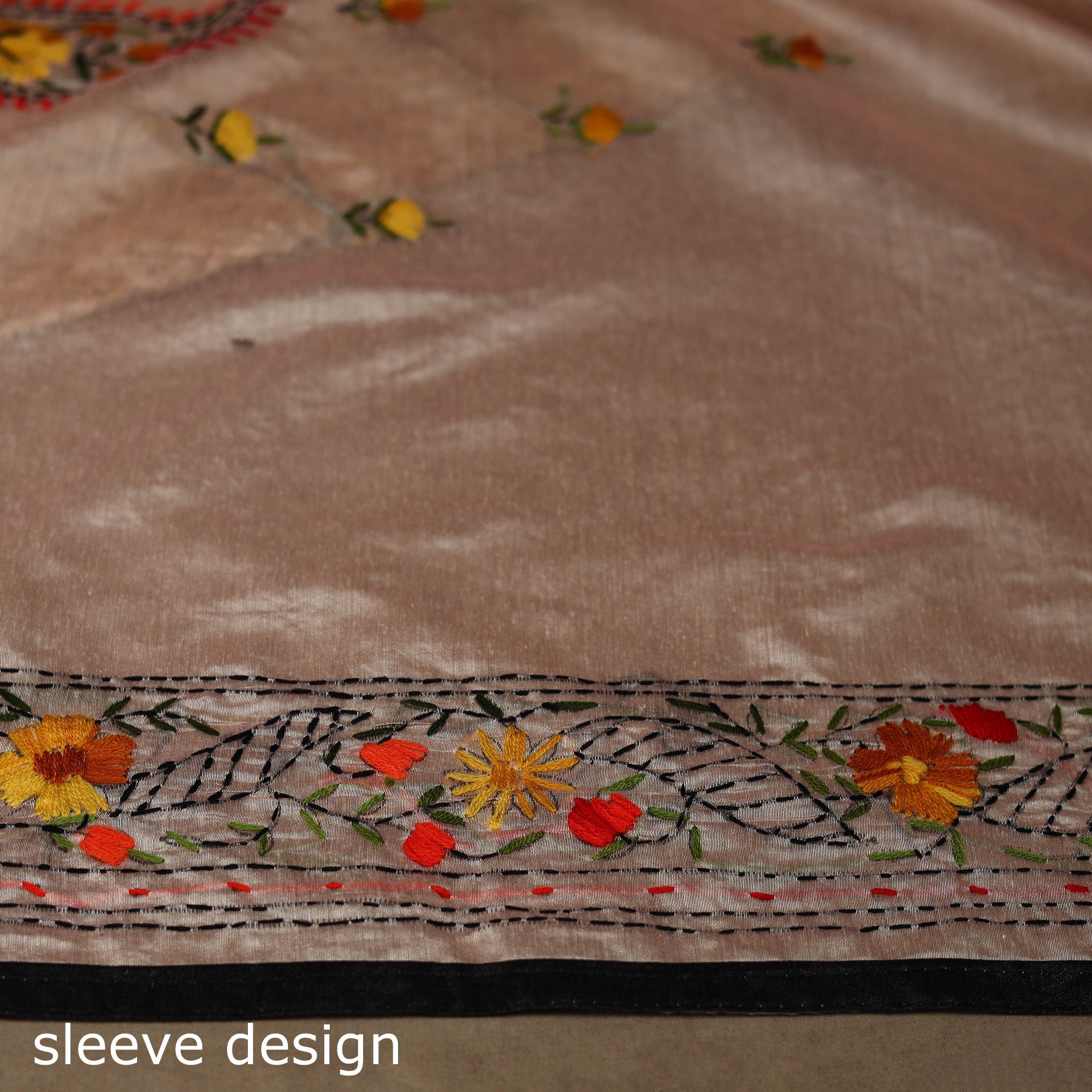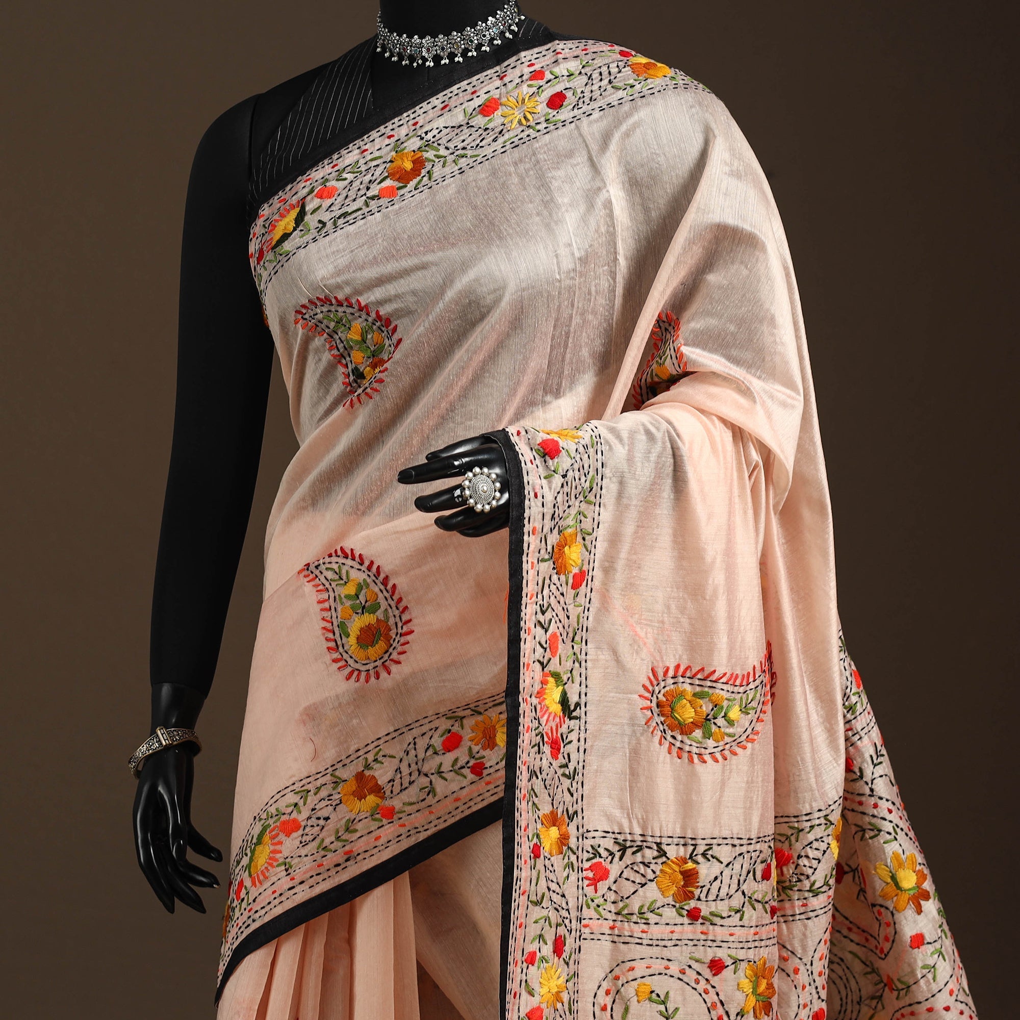 Add a touch of grace to your wardrobe with this pink bengal chanderi silk cotton saree featuring beautiful embroidery. Crafted by skilled artisans from West Bengal, this saree highlights fine threadwork that enhances the soft sheen of chanderi silk cotton. Each motif is carefully hand-embroidered, making it perfect for festive or elegant occasions.