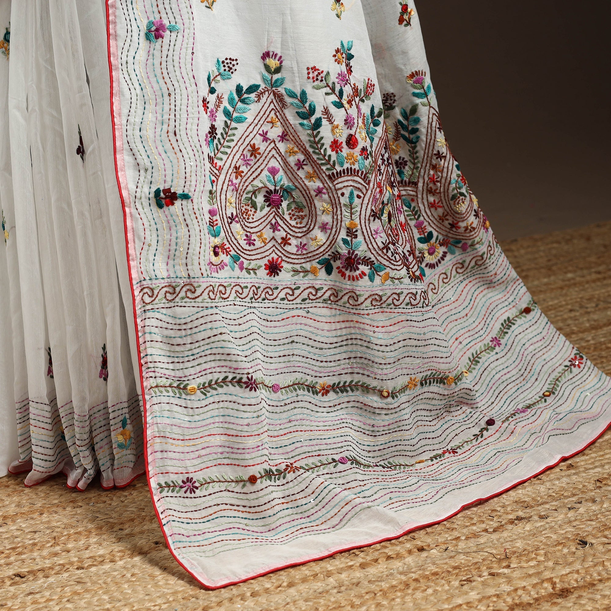 Add a touch of grace to your wardrobe with this white bengal chanderi silk cotton saree featuring beautiful embroidery. Crafted by skilled artisans from West Bengal, this saree highlights fine threadwork that enhances the soft sheen of chanderi silk cotton. Each motif is carefully hand-embroidered, making it perfect for festive or elegant occasions.