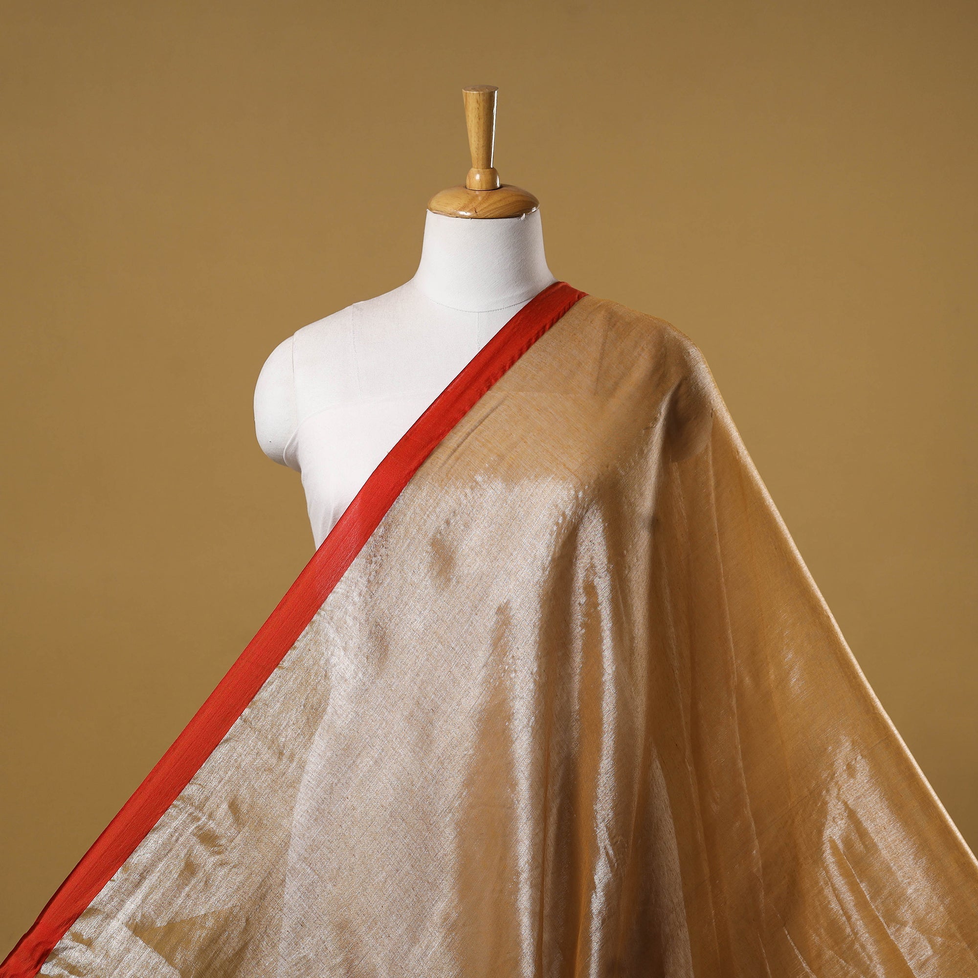 The fine tissue zari brown plain fabric beautifully reflects Bengal’s celebrated weaving tradition. Crafted with cotton, this plain weave fabric, interlaced with delicate zari threads, offers a subtle shimmer, making it perfect for clothing.