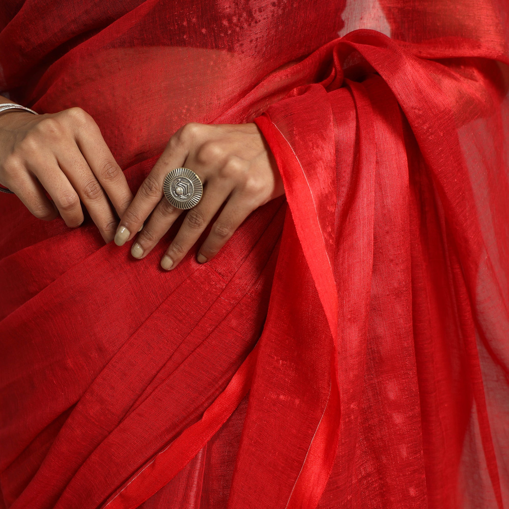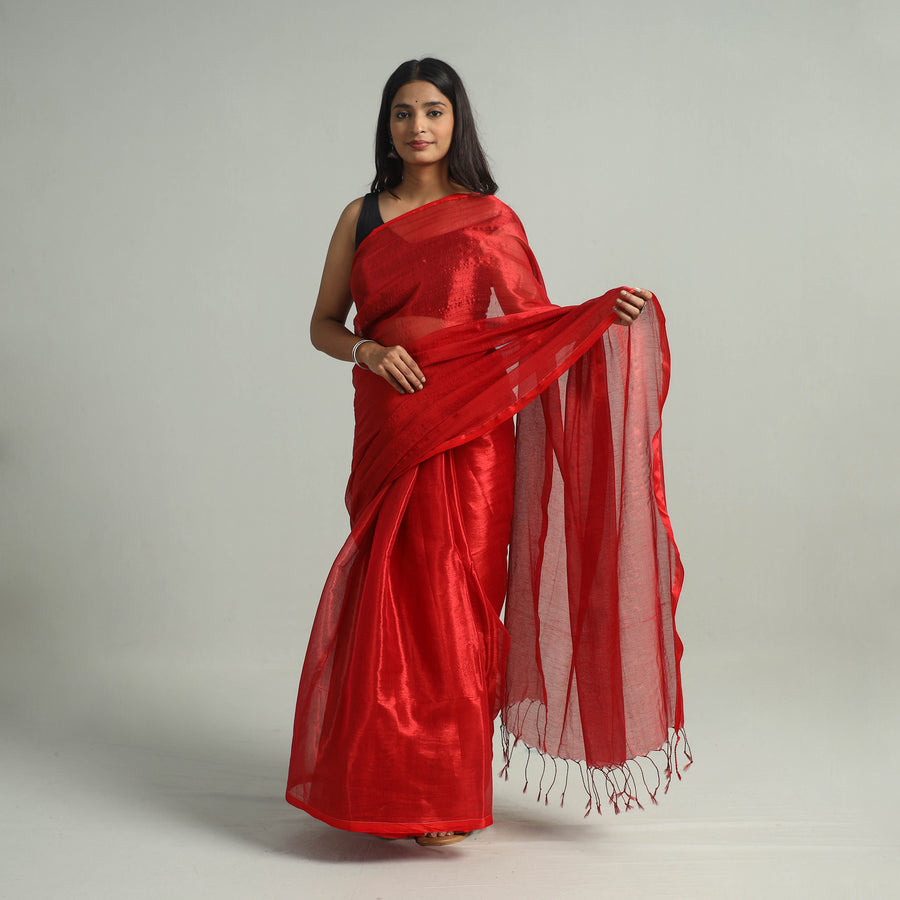 Indulge in the opulence of our fine-quality tissue zari work red saree, a true masterpiece of craftsmanship and elegance. This exquisite saree, detailed by skilled artisans, reflects centuries of traditional craftsmanship from West Bengal.