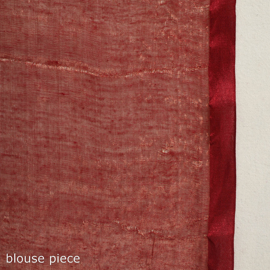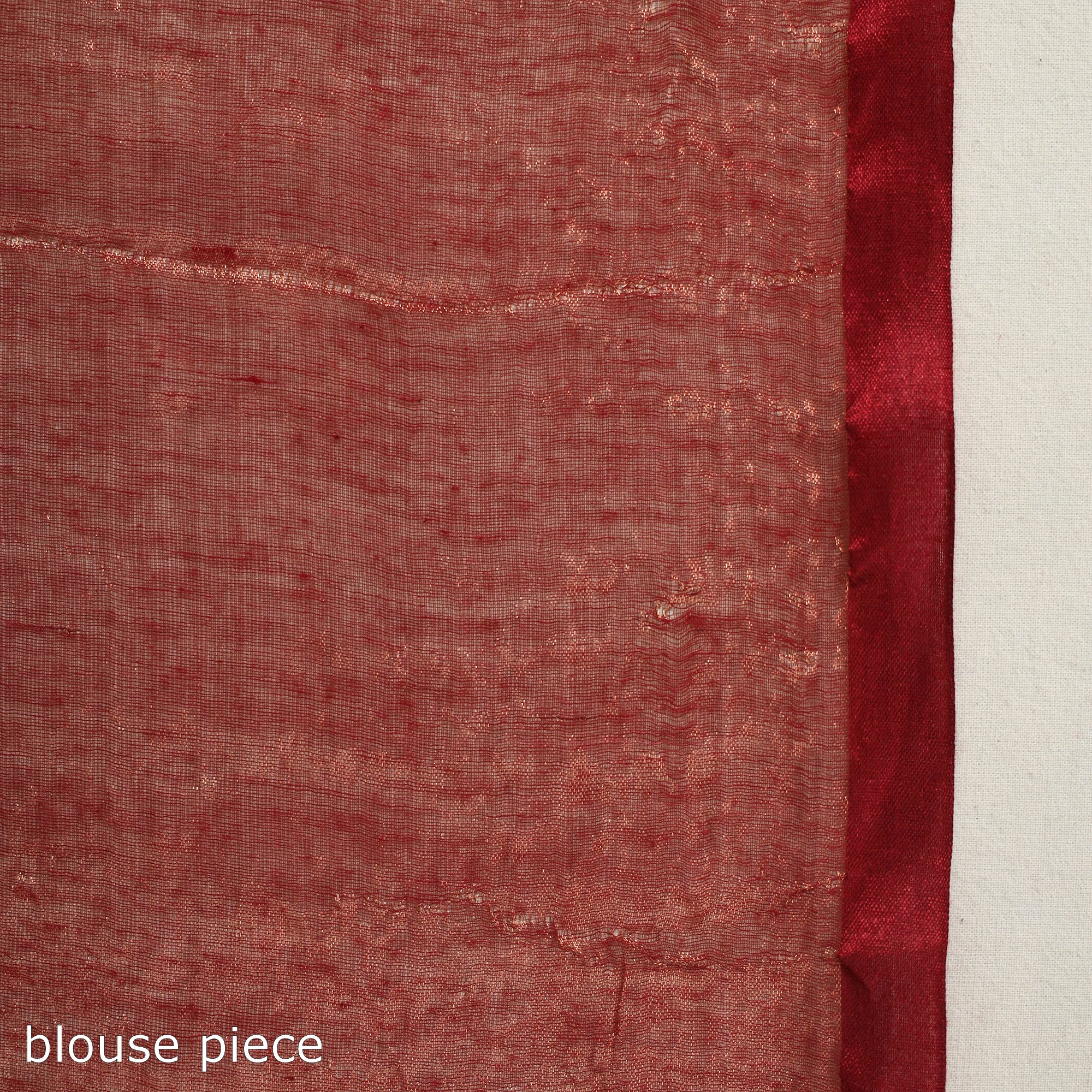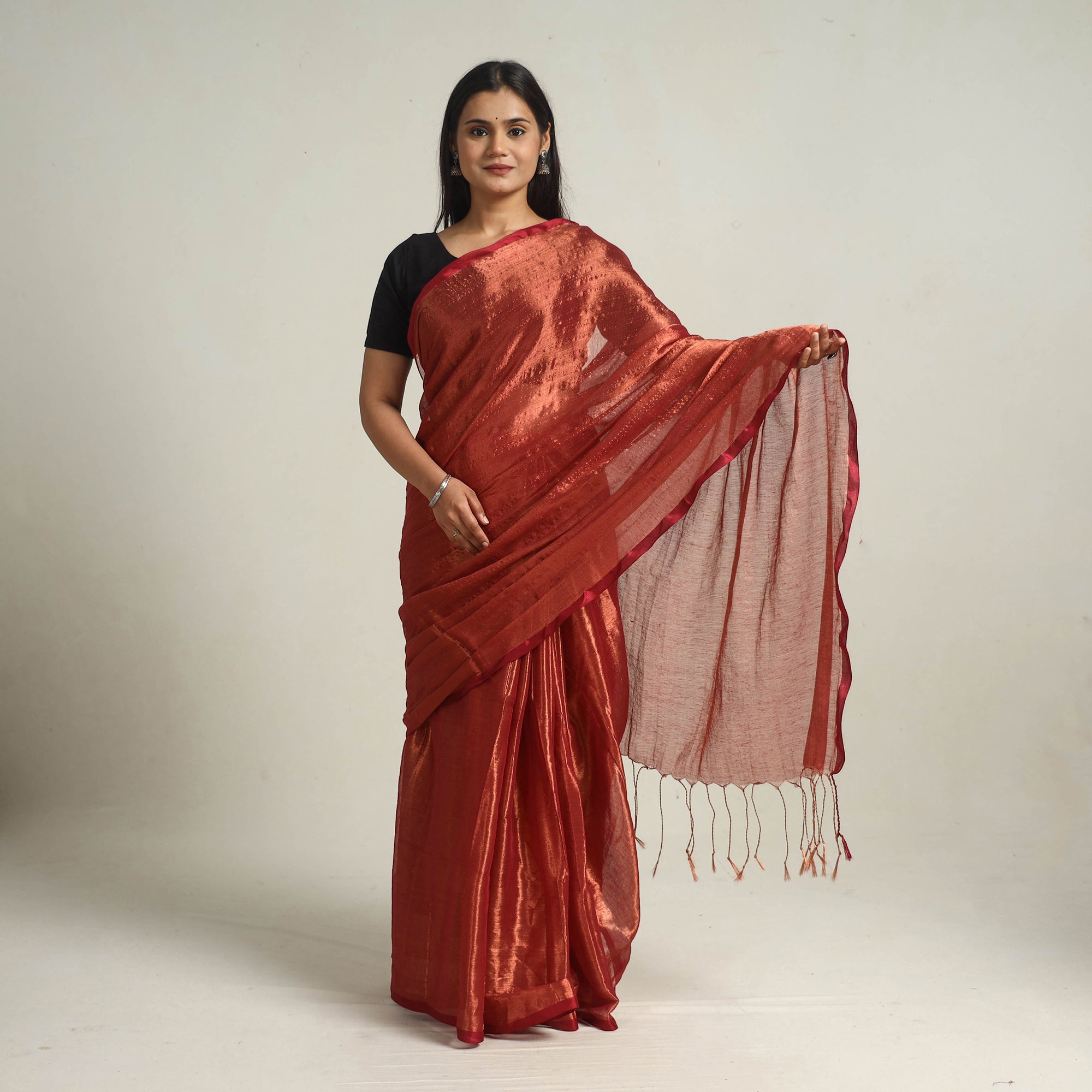 Indulge in the opulence of our fine-quality tissue zari work maroon saree, a true masterpiece of craftsmanship and elegance. This exquisite saree, detailed by skilled artisans, reflects centuries of traditional craftsmanship from West Bengal.