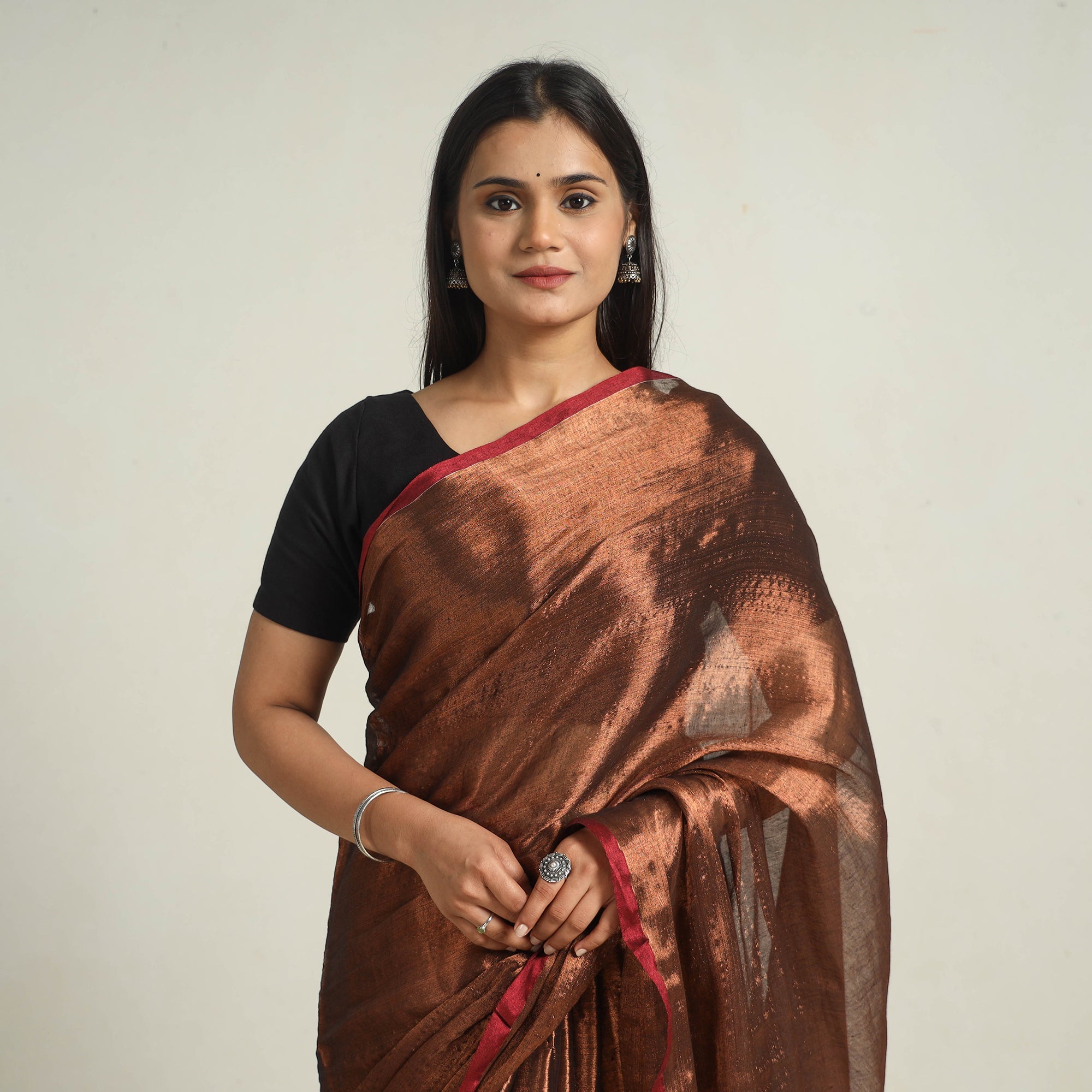 Indulge in the opulence of our fine-quality tissue zari work brown saree, a true masterpiece of craftsmanship and elegance. This exquisite saree, detailed by skilled artisans, reflects centuries of traditional craftsmanship from West Bengal.