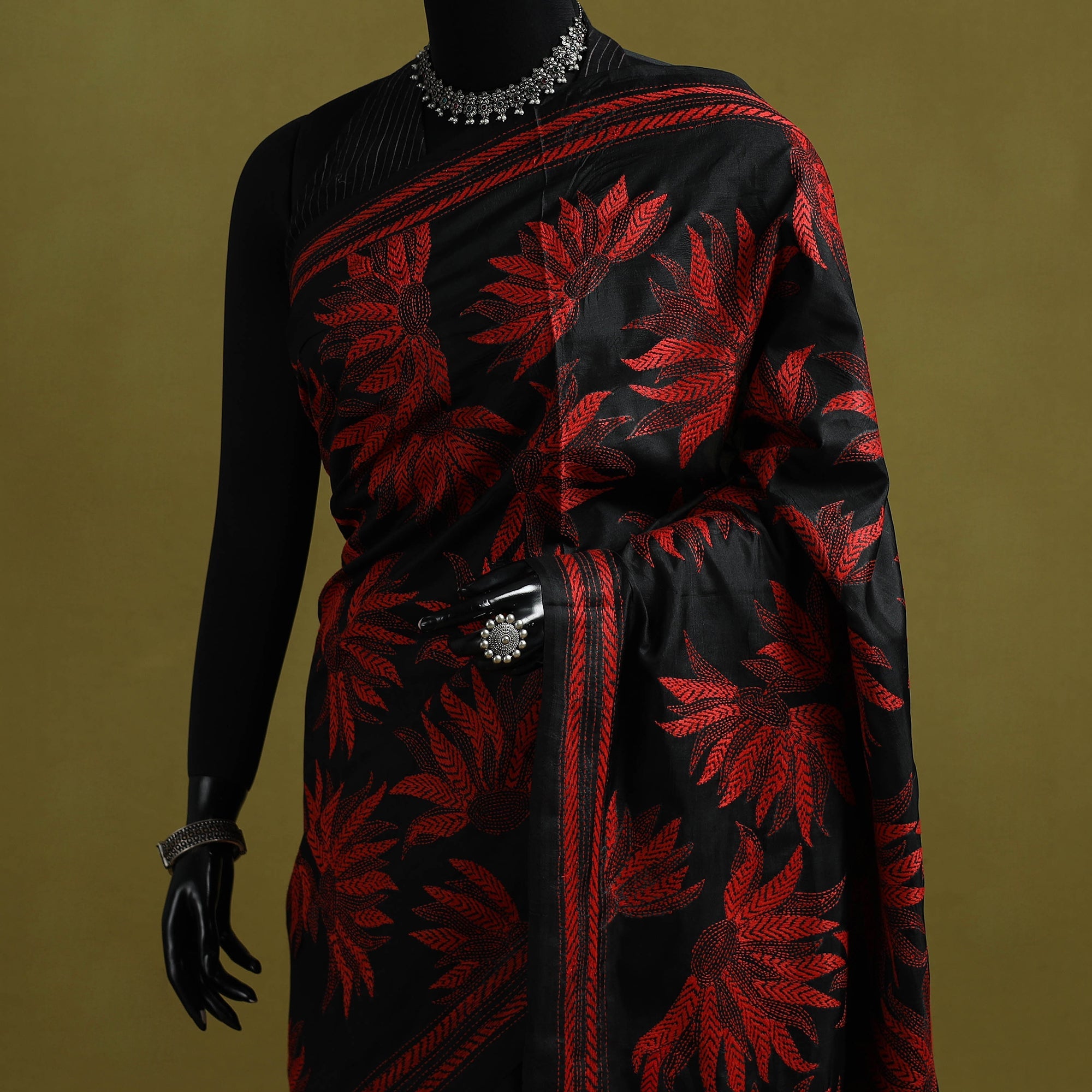 Kantha work handloom saree from West Bengal features a centuries-old hand embroidery tradition practiced by rural women artisans. It showcases motifs inspired by rural life, folk tales, mythological stories, flowers, leaves, animals and geometric forms. Crafted on bangalore silk, known for its purity and rich texture, this saree is ideal for weddings, festive occasions and cultural gatherings.
