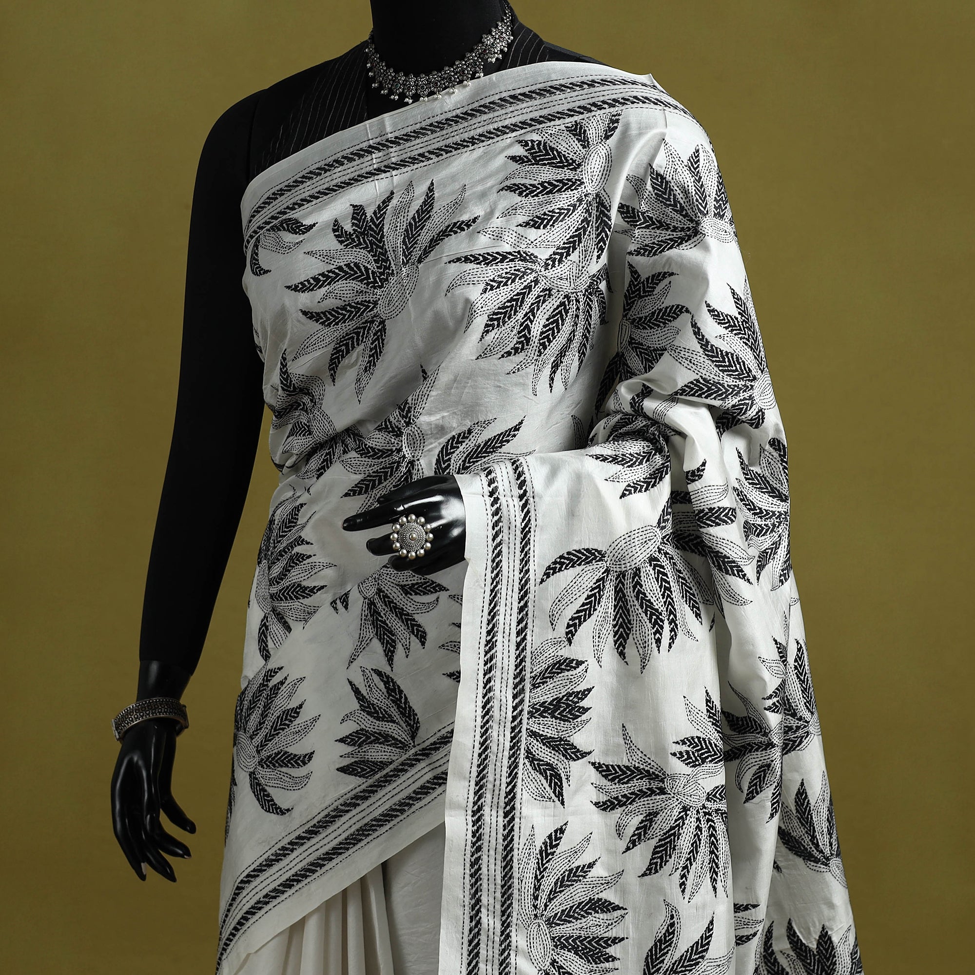 Kantha work handloom saree from West Bengal features a centuries-old hand embroidery tradition practiced by rural women artisans. It showcases motifs inspired by rural life, folk tales, mythological stories, flowers, leaves, animals and geometric forms. Crafted on bangalore silk, known for its purity and rich texture, this saree is ideal for weddings, festive occasions and cultural gatherings.