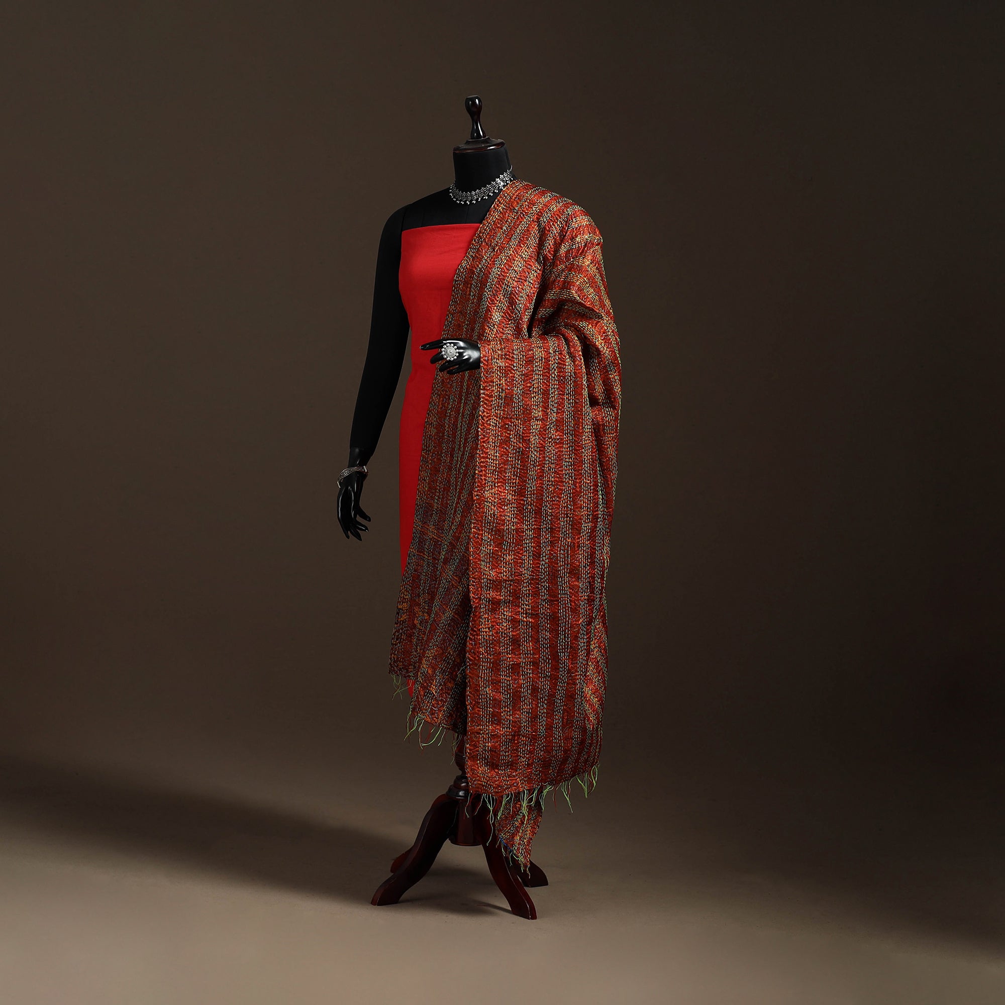 Multicolor kantha hand-embroidery patchwork reversible dupatta crafted in art silk. The fine kantha handwork reflect Bengal’s rich heritage, while the reversible design adds versatility. Its patchwork patterns offer a unique charm with a contemporary touch. Perfect for casual wear, this dupatta pairs well with a wide range of outfits.