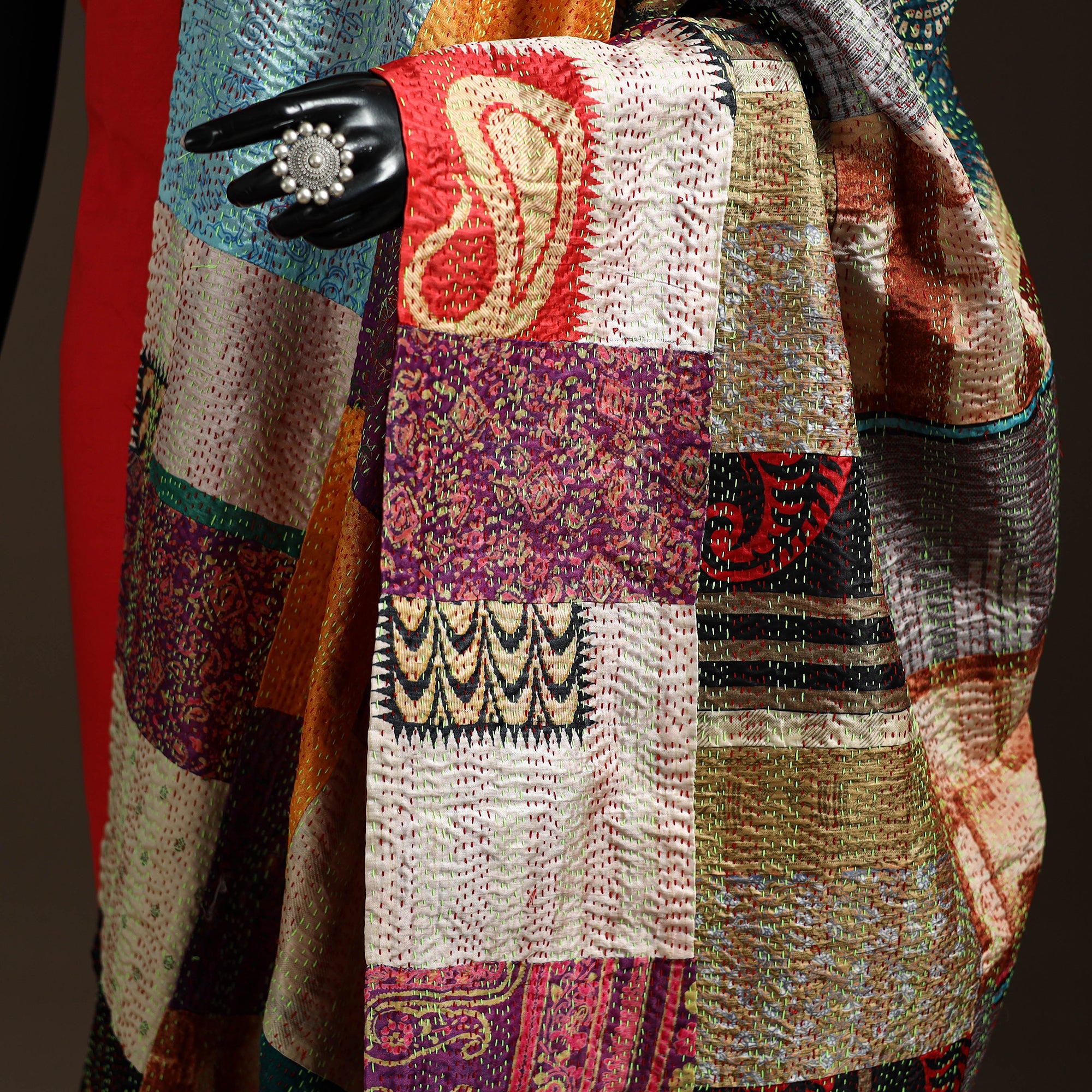 • Multicolor - Bengal Hand Embroidery Patchwork Reversible Silk Kantha Dupatta 100