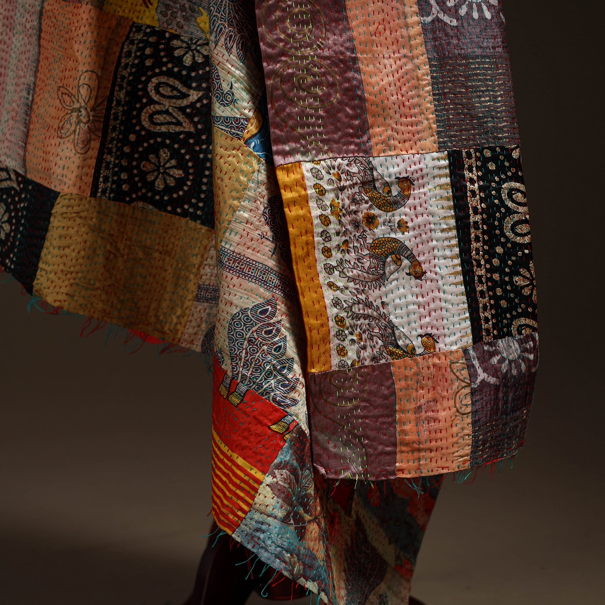 • Multicolor - Bengal Hand Embroidery Patchwork Reversible Silk Kantha Dupatta 15