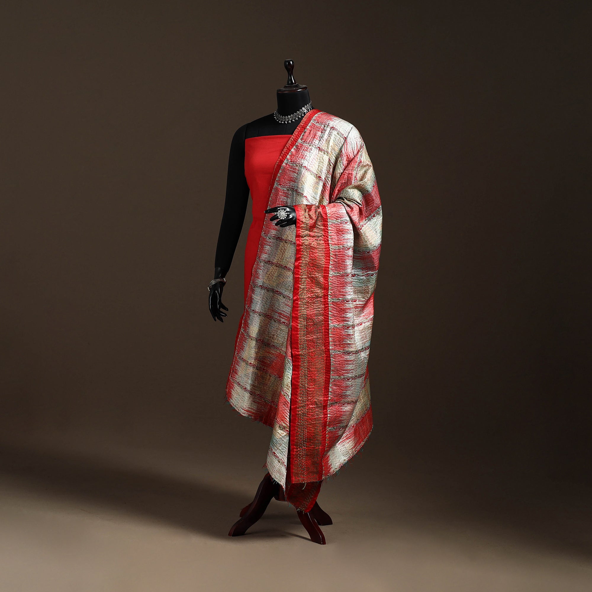 Multicolor kantha hand-embroidery patchwork reversible dupatta crafted in art silk. The fine kantha handwork reflect Bengal’s rich heritage, while the reversible design adds versatility. Its patchwork patterns offer a unique charm with a contemporary touch. Perfect for casual wear, this dupatta pairs well with a wide range of outfits.