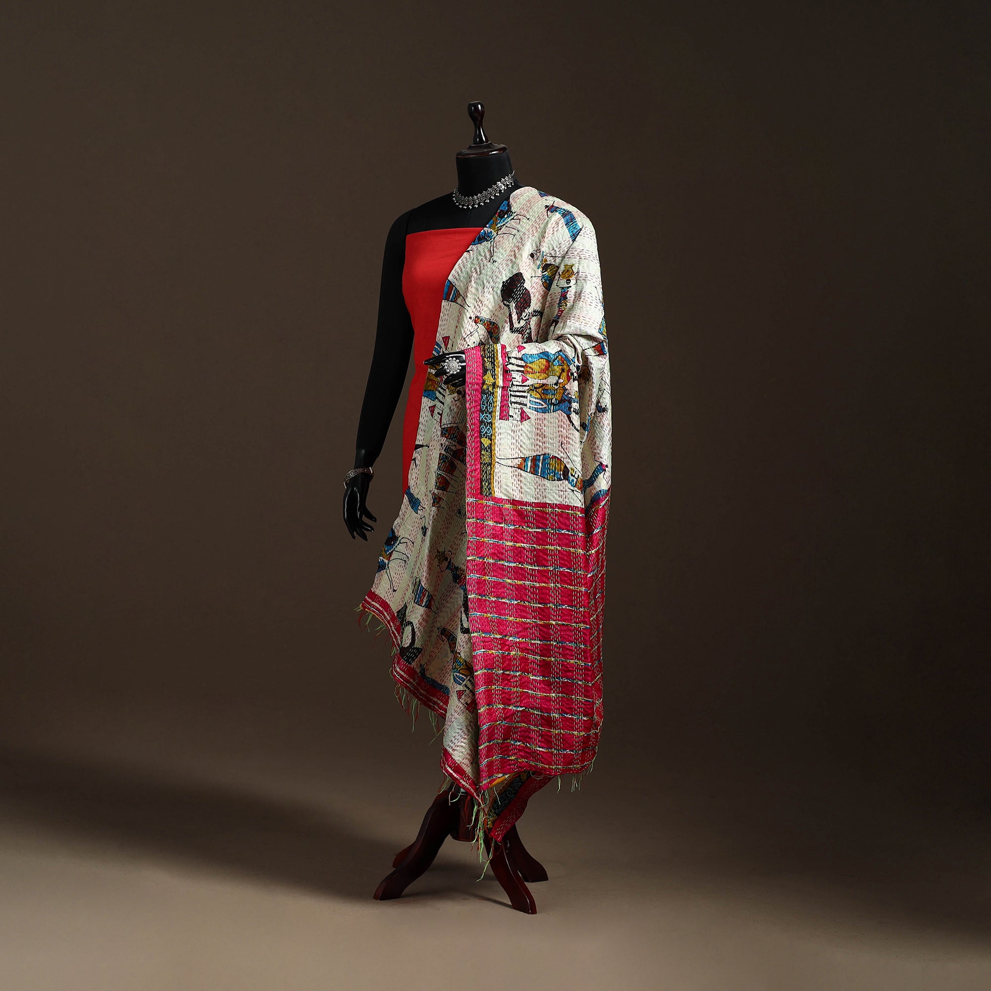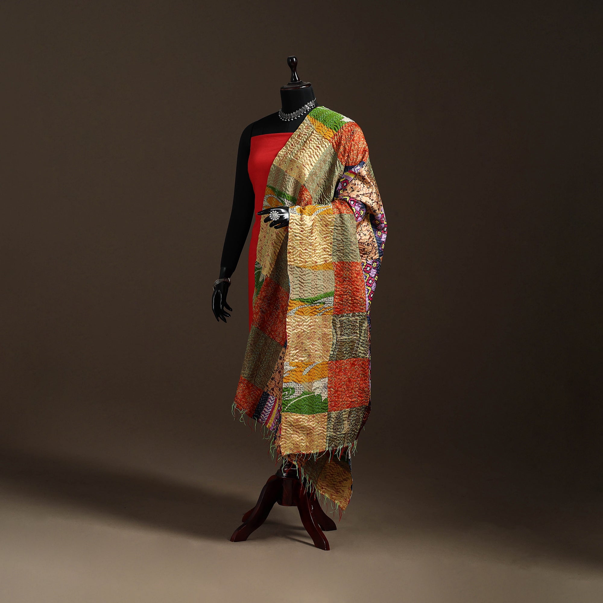 Multicolor - Bengal Hand Embroidery Patchwork Reversible Silk Kantha Dupatta 25