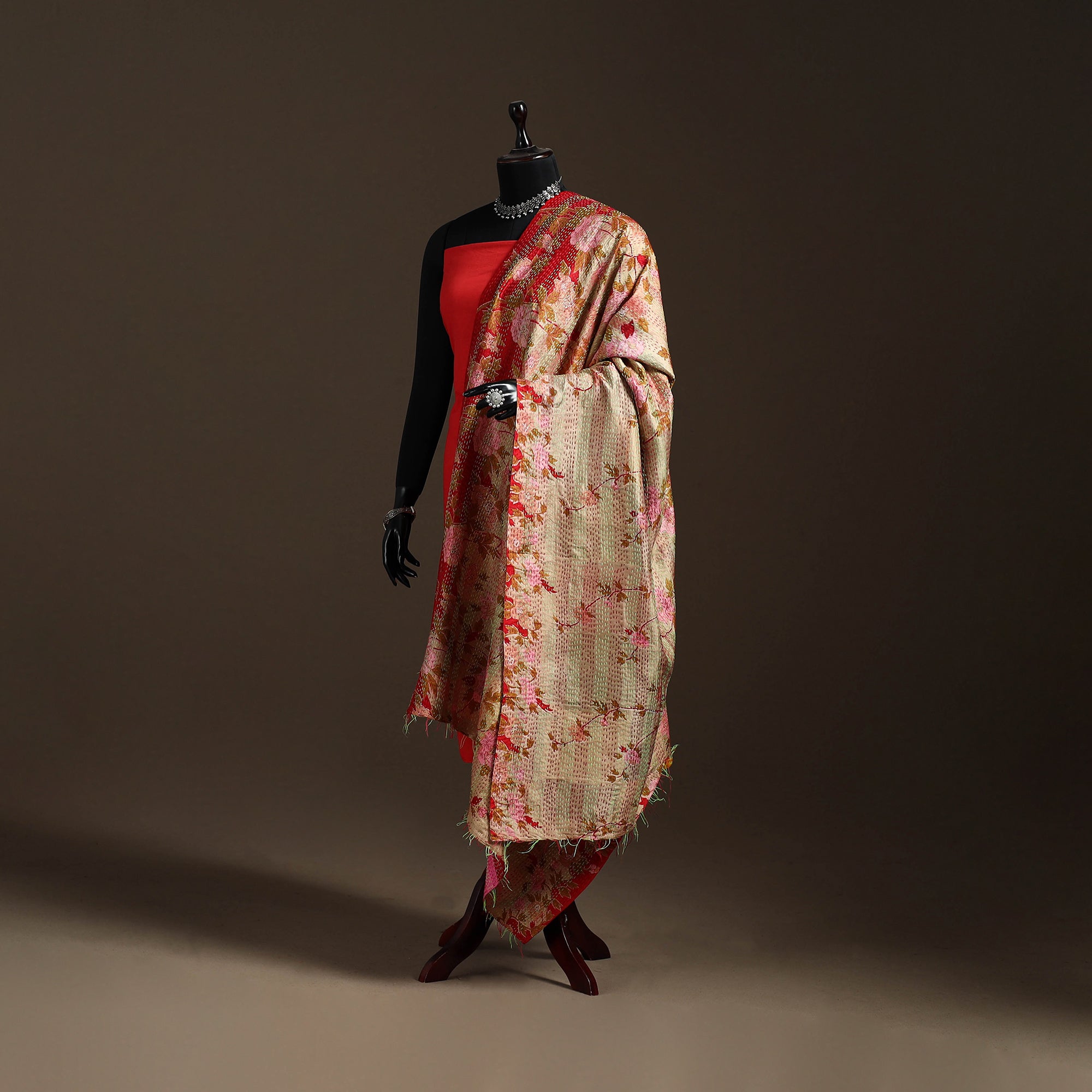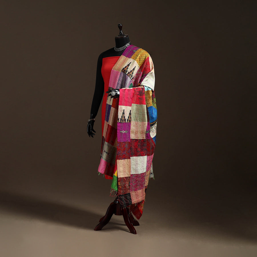 Multicolor - Bengal Hand Embroidery Patchwork Reversible Silk Kantha Dupatta 32