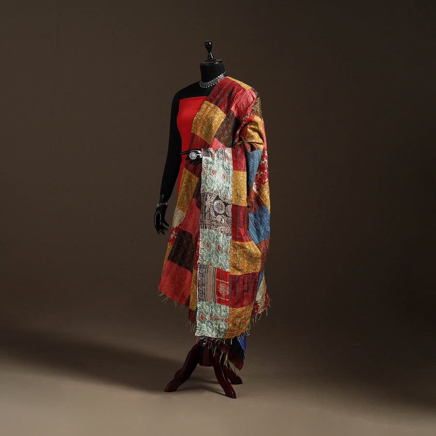 Multicolor - Bengal Hand Embroidery Patchwork Reversible Silk Kantha Dupatta 38