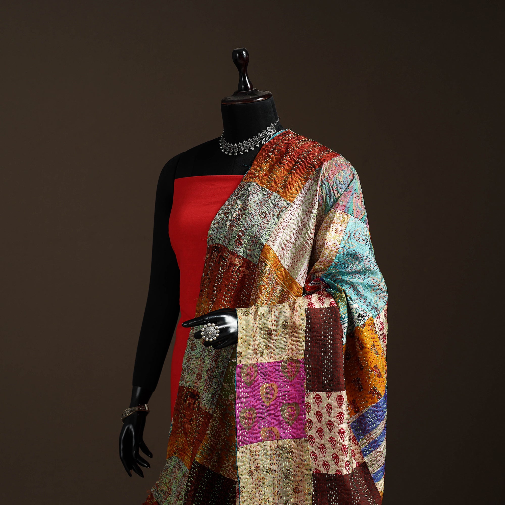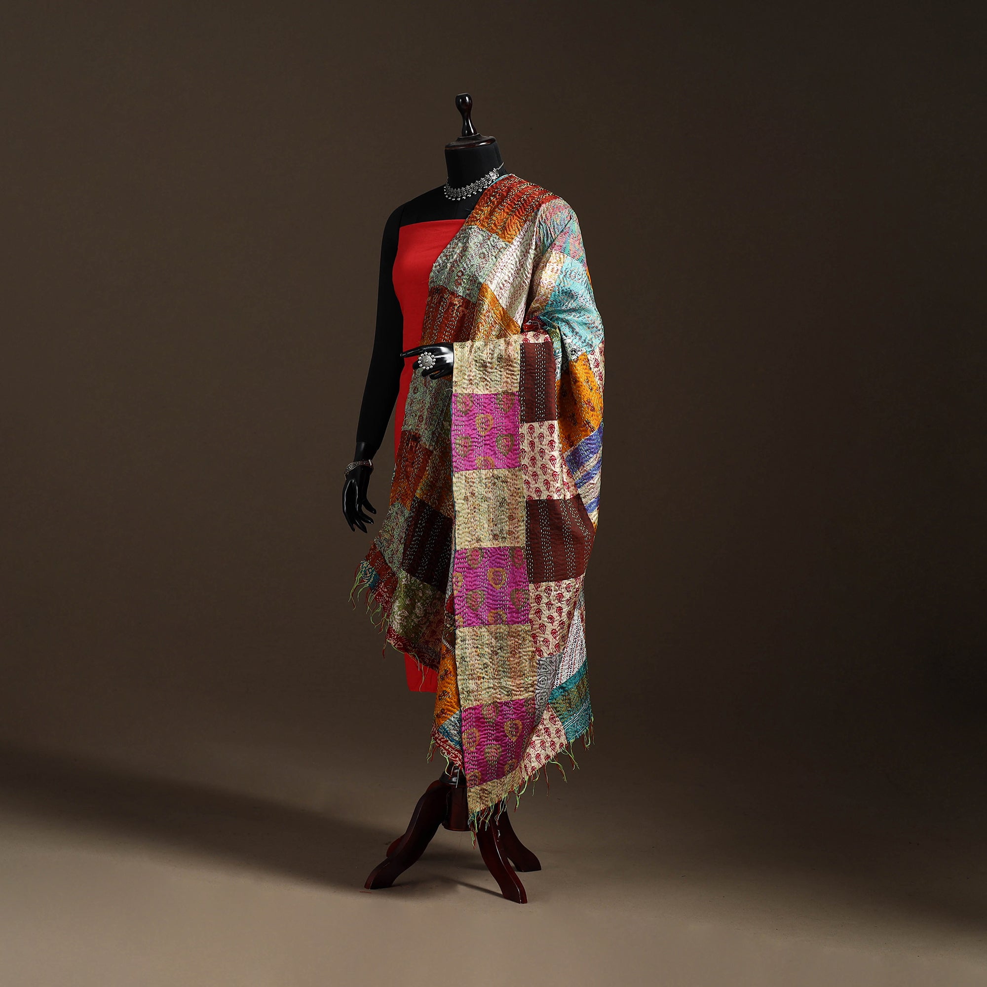 Multicolor - Bengal Hand Embroidery Patchwork Reversible Silk Kantha Dupatta 48