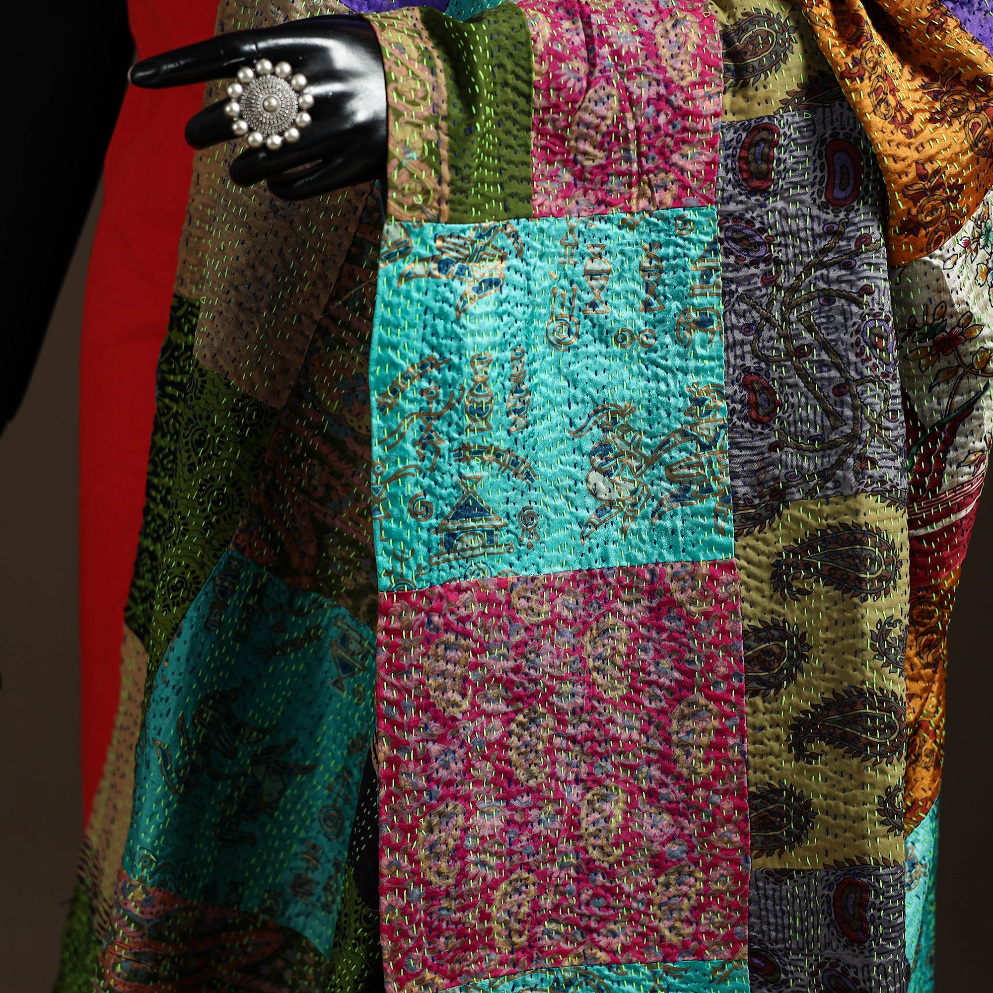 • Multicolor - Bengal Hand Embroidery Patchwork Reversible Silk Kantha Dupatta 52