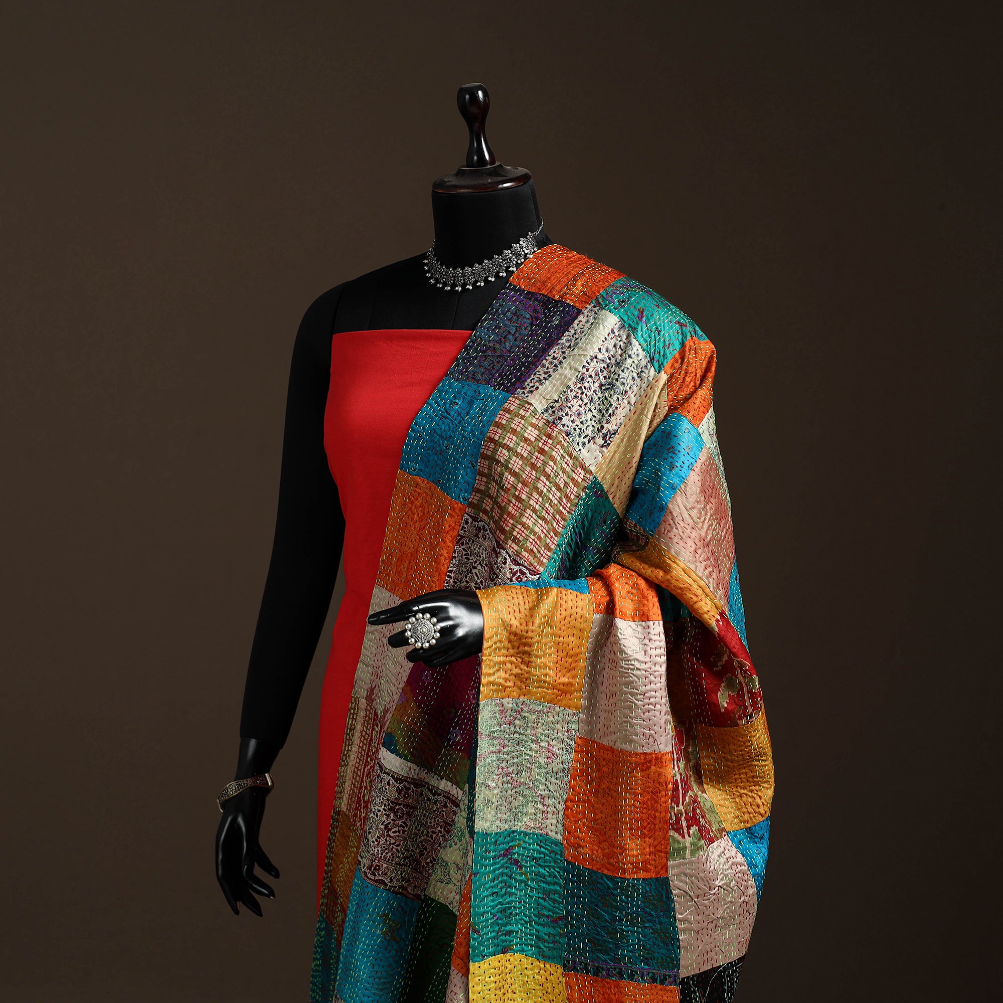 • Bengal Hand Embroidery Patchwork Reversible Silk Kantha Dupatta 57