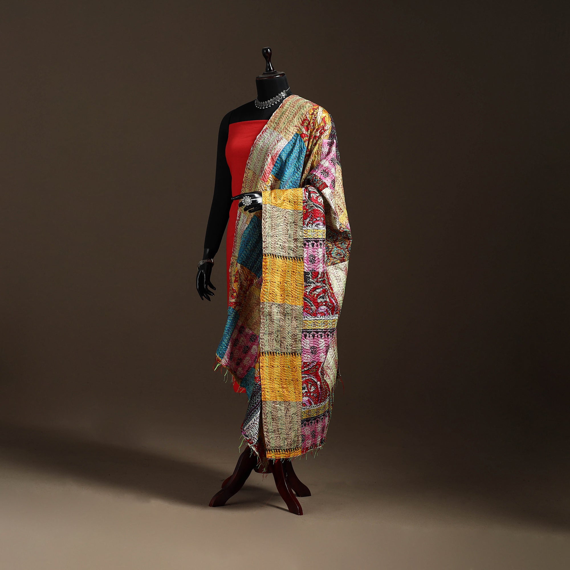 Multicolor - Bengal Hand Embroidery Patchwork Reversible Silk Kantha Dupatta 58
