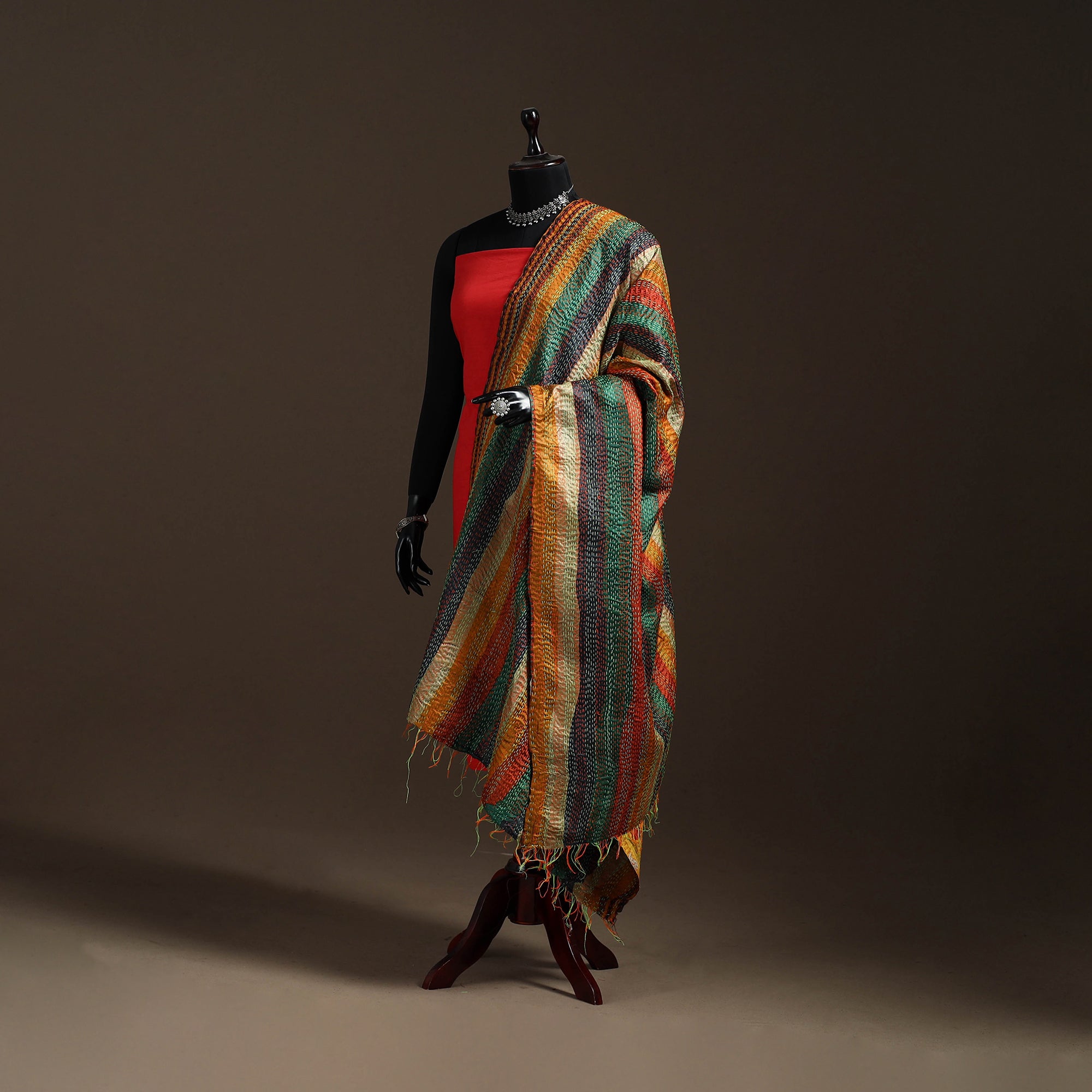 Multicolor kantha hand-embroidery patchwork reversible dupatta crafted in art silk. The fine kantha handwork reflect Bengal’s rich heritage, while the reversible design adds versatility. Its patchwork patterns offer a unique charm with a contemporary touch. Perfect for casual wear, this dupatta pairs well with a wide range of outfits.