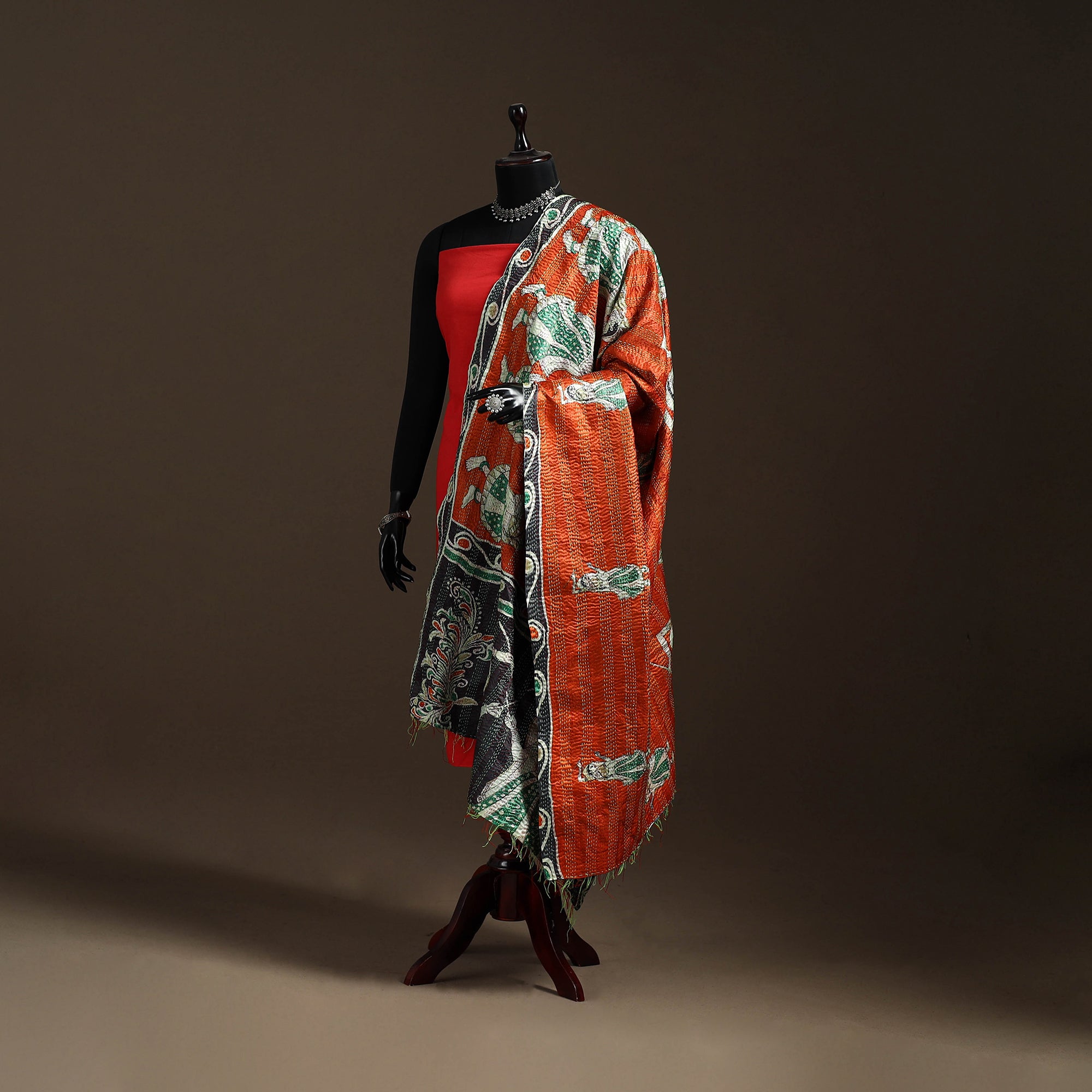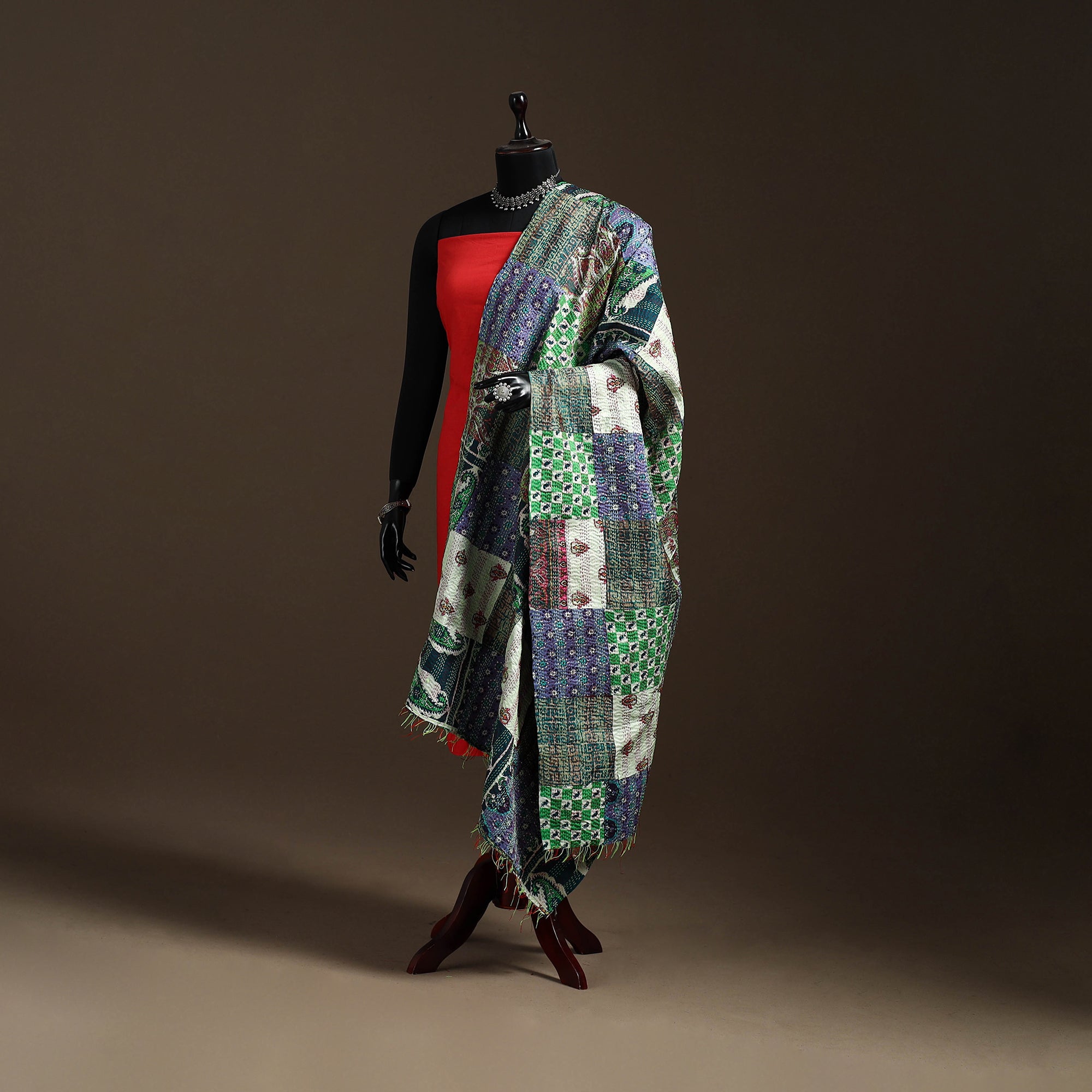 Multicolor - Bengal Hand Embroidery Patchwork Reversible Silk Kantha Dupatta 84