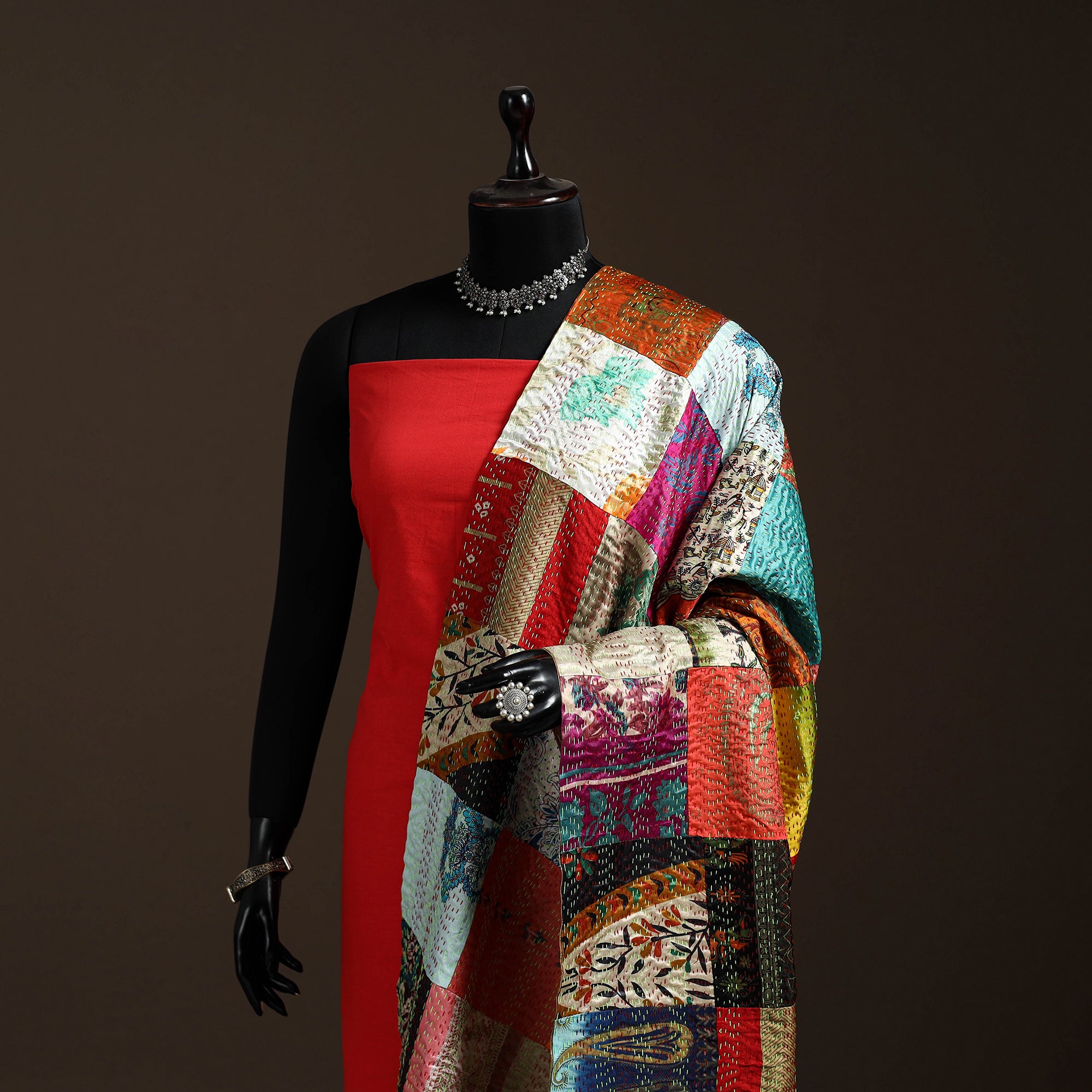 • Multicolor - Bengal Hand Embroidery Patchwork Reversible Silk Kantha Dupatta 87